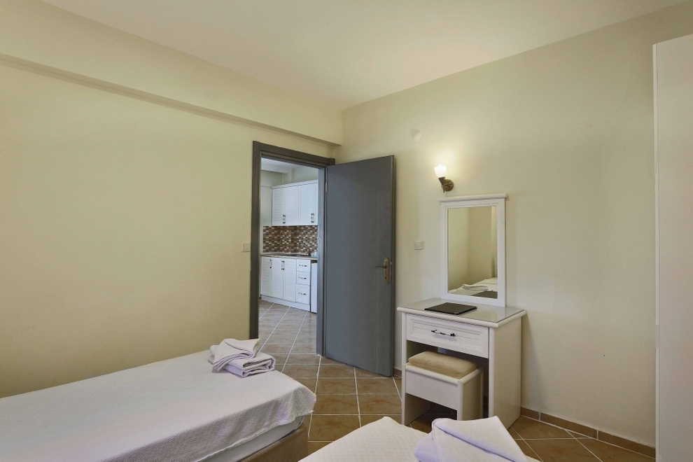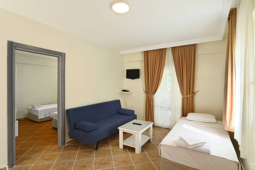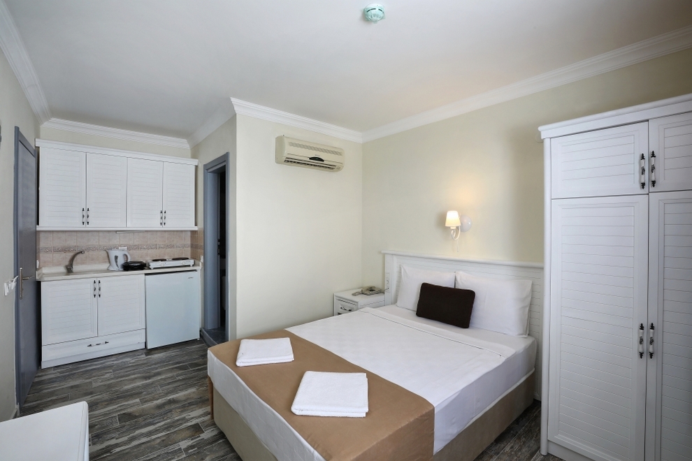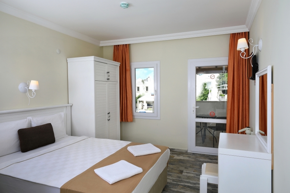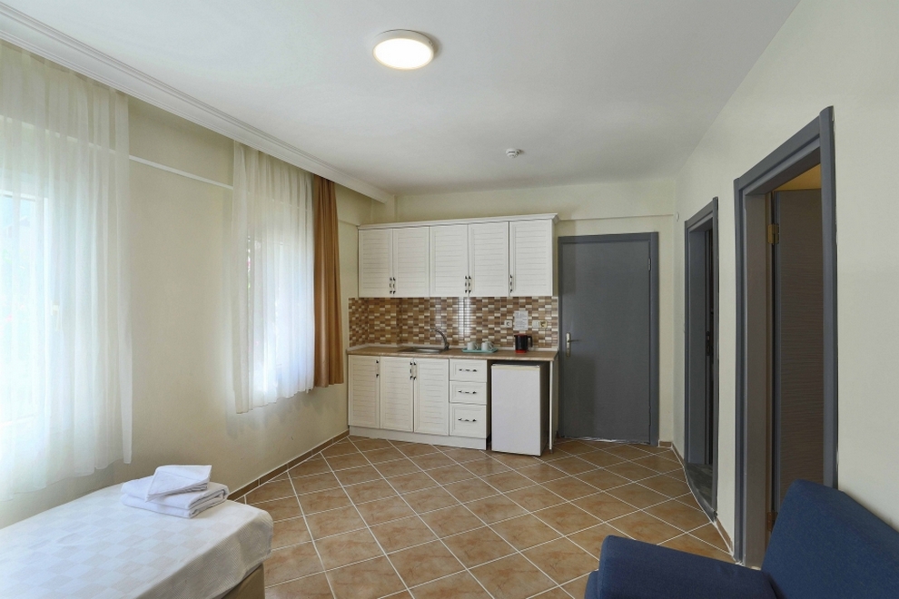 Климатизираните стаи разполагат с разполагат с кухненски бокс с мини хладилник и електрическа кана. В стандартното оборудване е включен и разтегателен диван. Балконите са с изглед към басейна или градините.