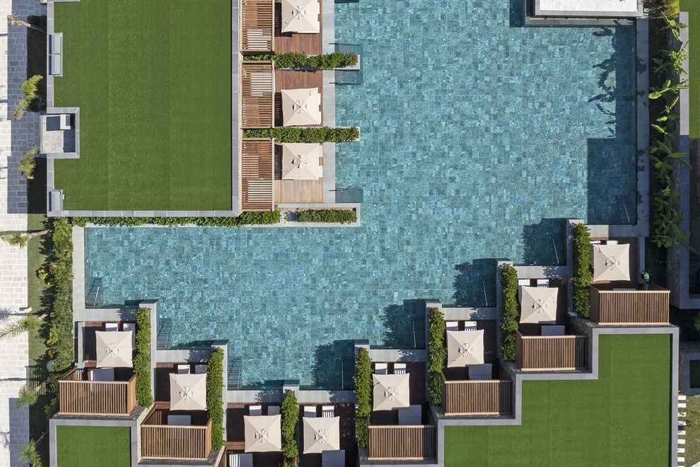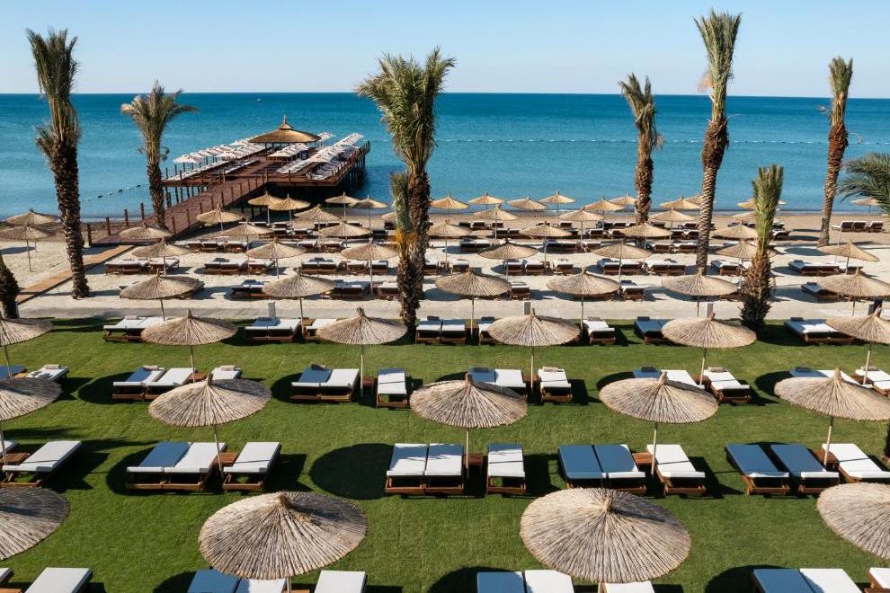 Собствен пясъчен плаж на 600 метра, с две пристанища. За удобство на гостите има основен басейн, басейни до голф игрището, басейн до плажа. Чадъри, шезлонги и плажни кърпи се предоставят безплатно.