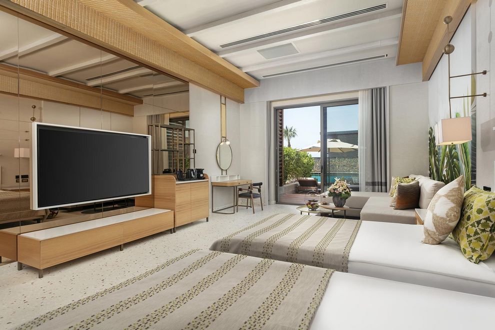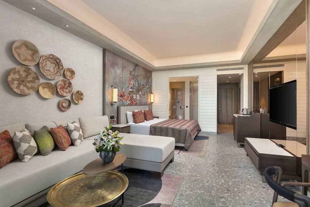 Хотелът се състои от основна 8-етажна сграда (8 асансьора) и вили, в които са разпределени 600 климатизирани стаи. Стаите в основната сграда са с гледка море, голф игрище или градина. Има също стаи Lagoon и Вили. Всяка стая обзавдена с комфортни легла и матраци, сателитна телевизия, телефон, минибар, сет за кафе и чай, сейф, баня с душ, премиум козметика Etro/ Bvlgari, козметично огледало, халат и чехли за СПА, сешоар, балкон, Wi-Fi, меню с избор на възглавници, дигитален ключ за осветление.