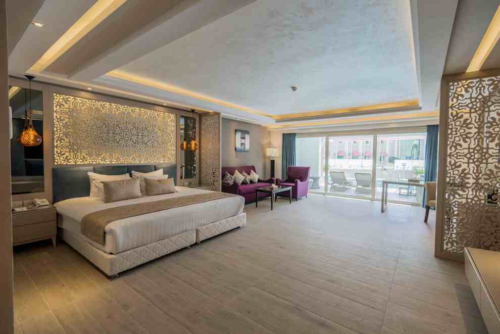 Хотелът посреща гостите си в 252 климатизирани стаи с изглед към сушата, морето, басейна или странична гледка към морето. В стаите има телевизор, телефон, баня с душ/вана, сешоар, халати и чехли, тоалетни принадлежности, сет за чай/кафе, минибар, сейф, балкон/тераса, Wi-Fi. Почистване на стаите и смяна на кърпи - всеки ден, смяна на спално бельо - 3 пъти седмично.