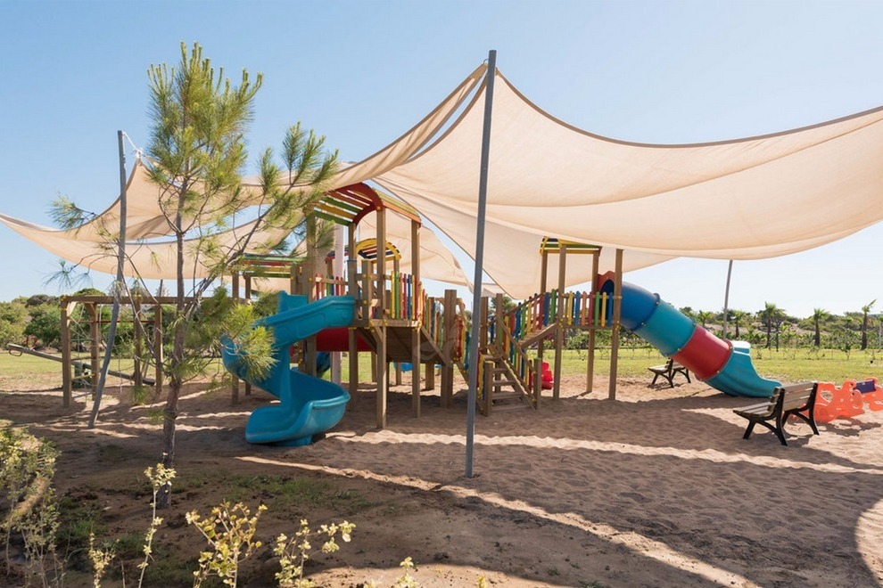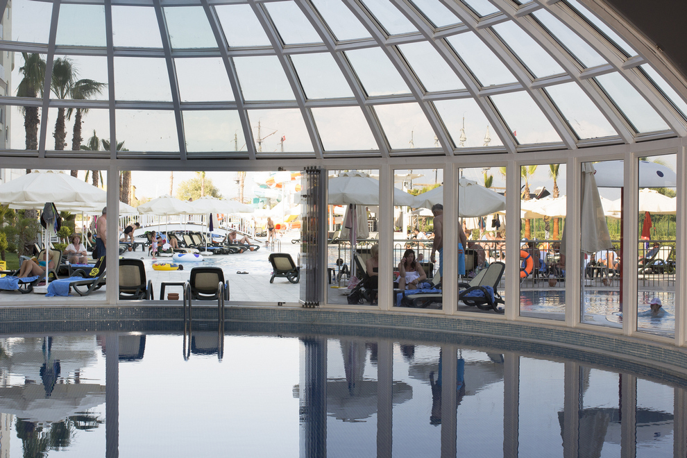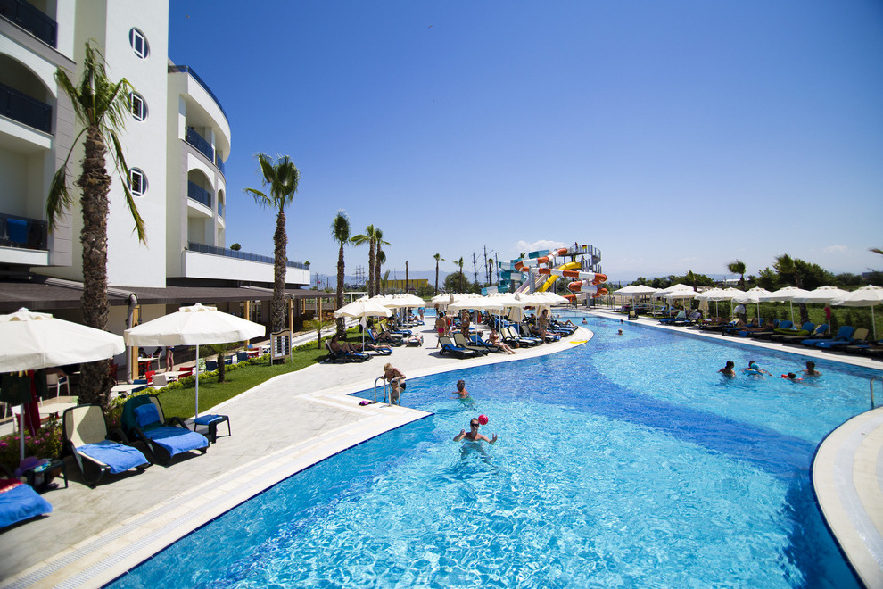 Собственият пясъчно-чакълест плаж на хотела се намира на 300 м и е дълъг 70 м. На разположение на гостите има 1 външен басейн с прясна вода, без отопление, 700 кв.м, дълбочина 140 см. 1 вътрешен отопляем басейн с прясна вода, 76 кв.м, дълбочина 140 см. Басейн с пързалки 85 кв.м, дълбочина 140 см. 6 водни пързалки за възрастни, без отопление. Пързалките работят в зависимост от метеорологичните условия.
