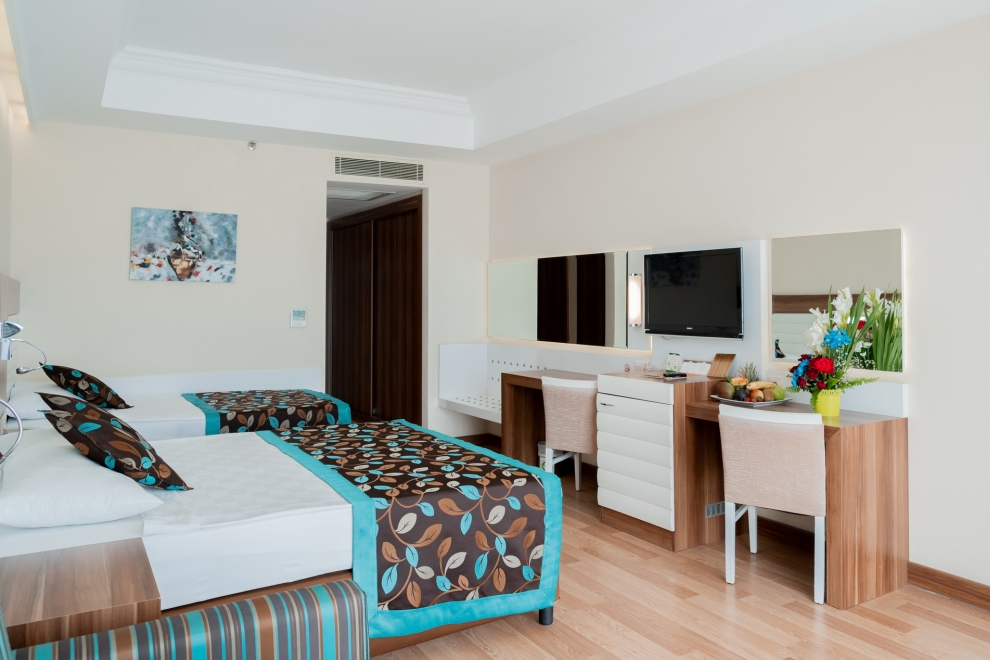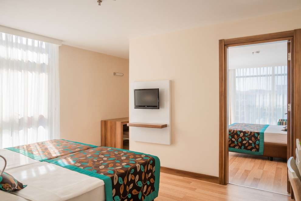 Family Room с 2 спални помещения разделени с врата, всяко спално помещение разполага с 1 двойно или 2 единични легла, максимално настаняване 2+2 деца, 3+1 дете, 4 възрастни.