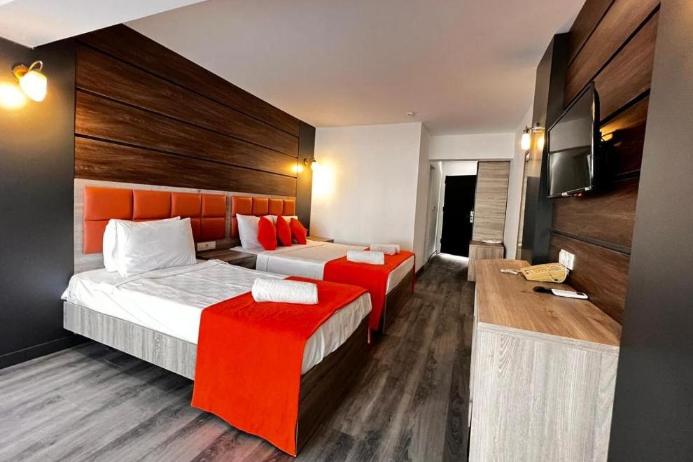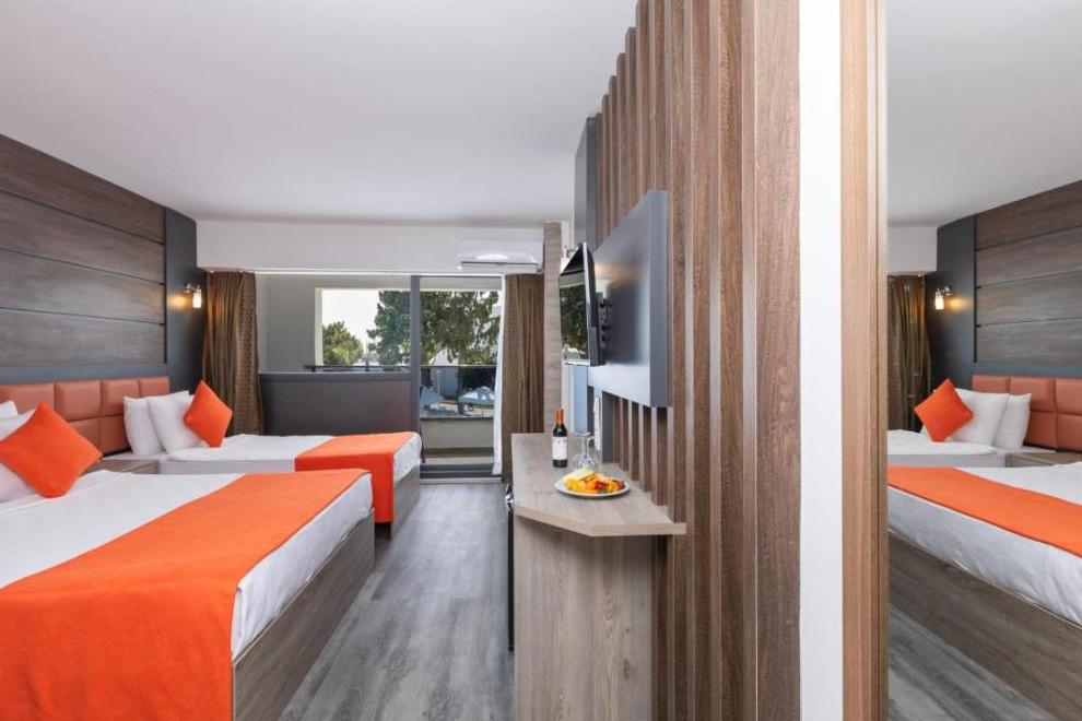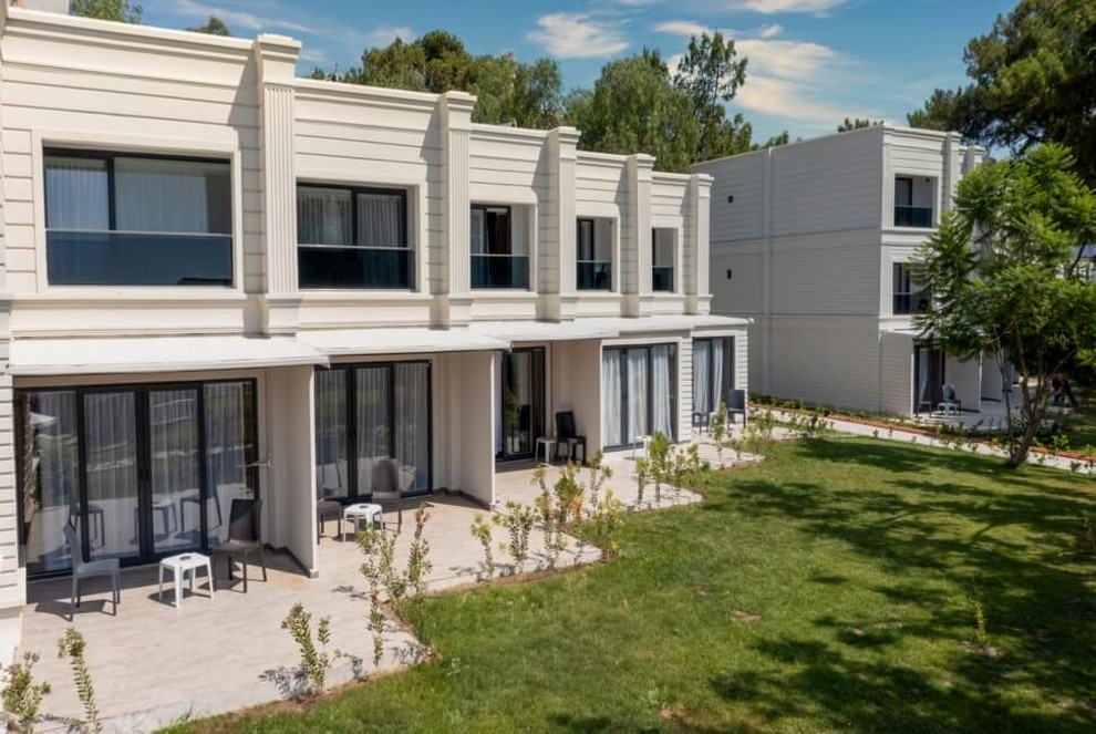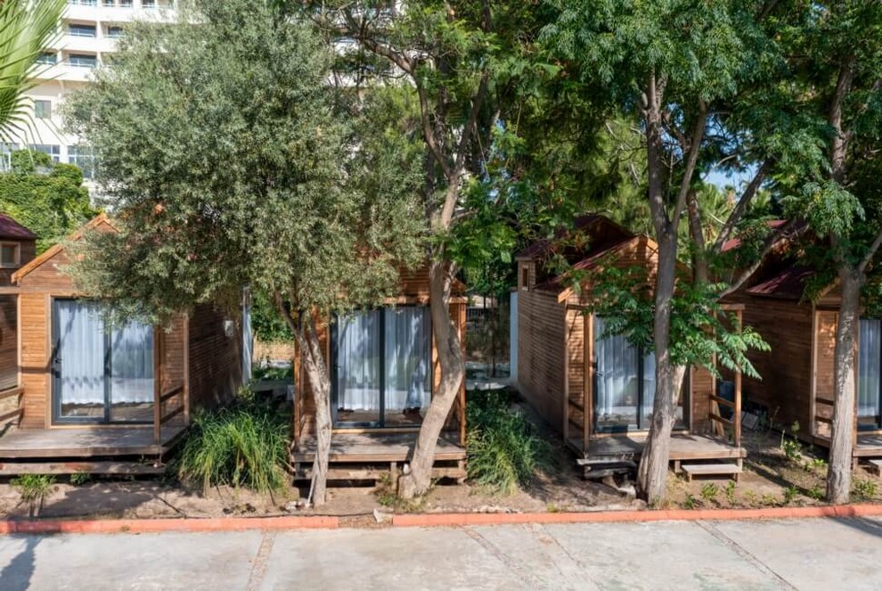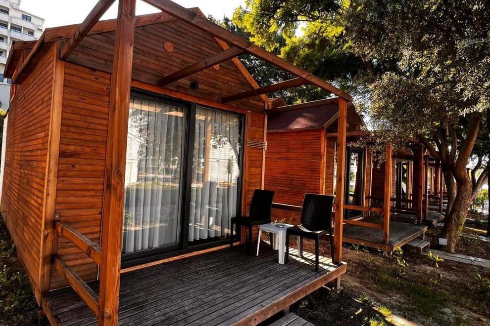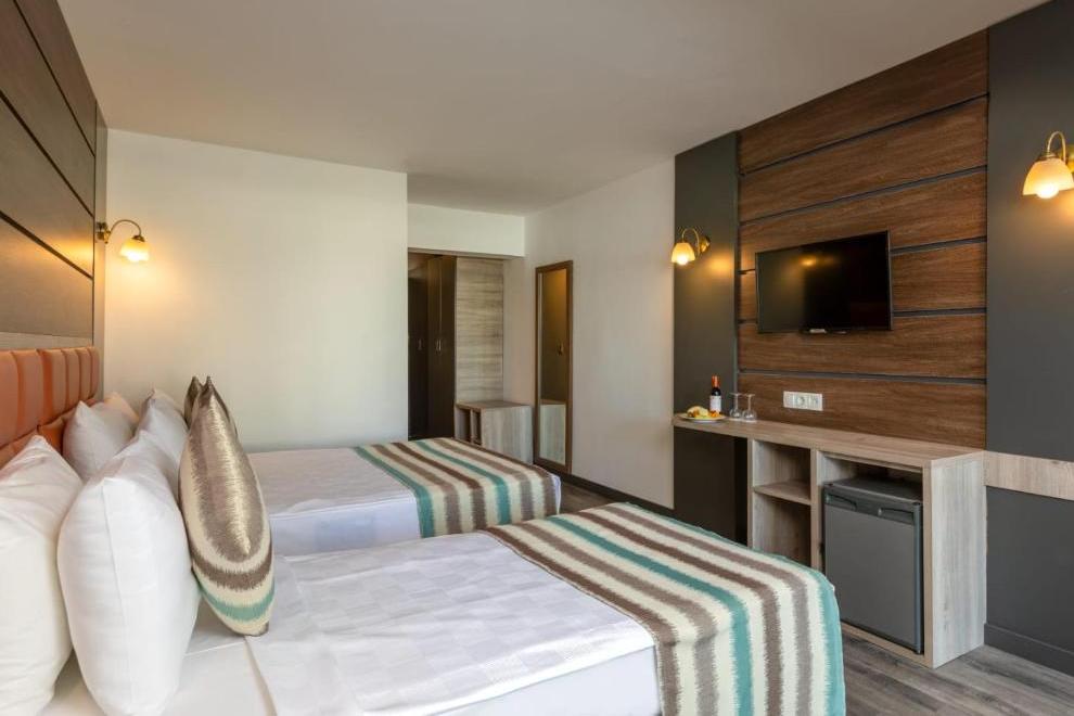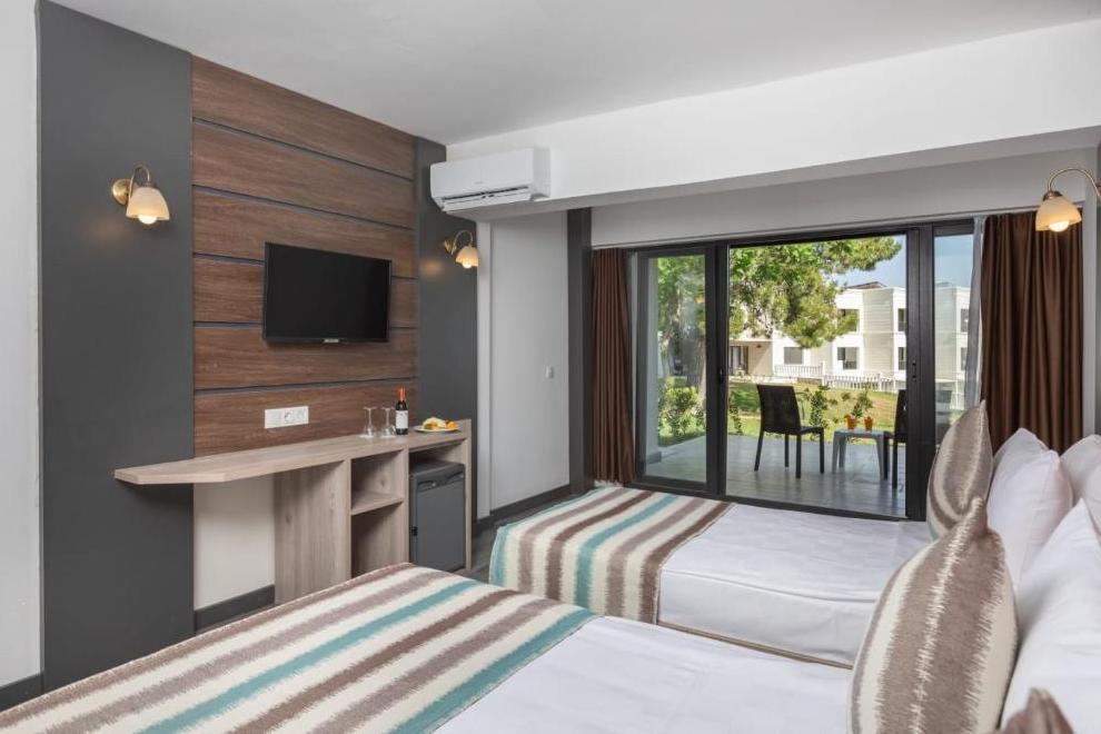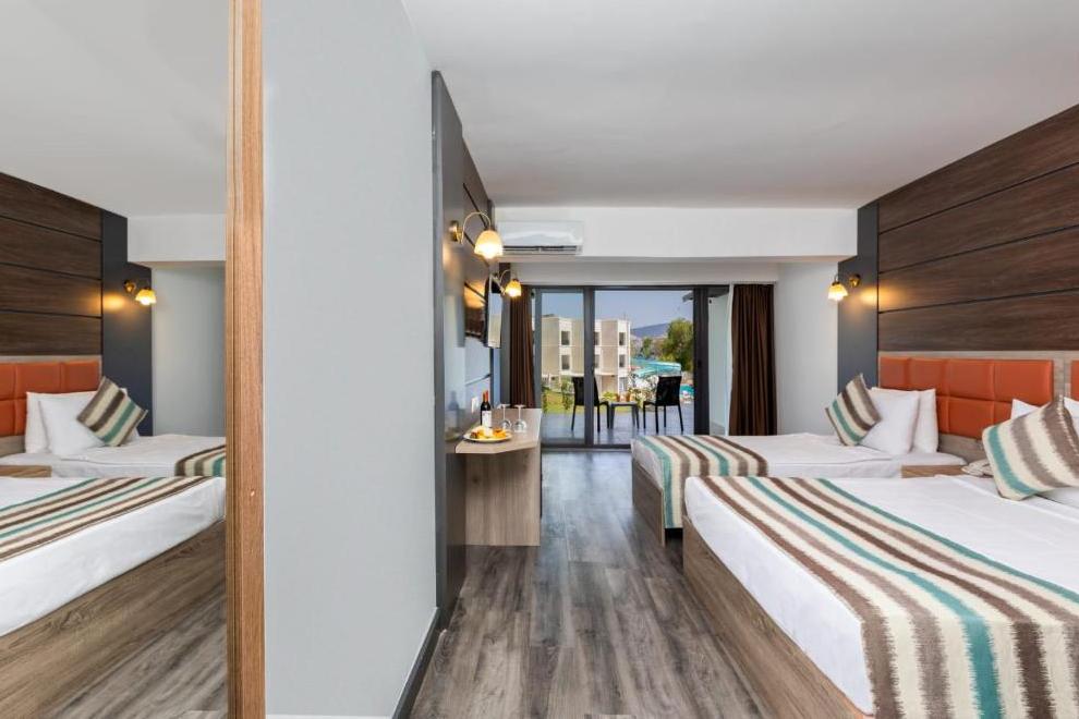 Състои се от 6 корпуса (3 етажа, няма асансьори), в които са разпределени 174 климатизирани стаи, от които 150 стандартни стаи (25 м²) с минибар, телевизор, сателитно излъчване, интернет връзка, директен телефон в банята и стаята, сейф, паркет, баня/душ и WC, огледало за грим и сешоар. 4 фамилни стаи (40 м²) (2 спални) В допълнение към функциите на стандартната стая; има още 1 спалня, минибар, телевизор, сателитно излъчване, интернет връзка, директен телефон в банята и стаята, сейф, паркет, баня/душ и WC, огледало за грим и сешоар. 10 малки къщички (20 m²) (дървена къща) минибар, телевизор, сателитно излъчване, интернет връзка, телефон с директно избиране в банята и стаята, сейф, паркет, баня/душ, тоалетна, огледало за грим и сешоар.