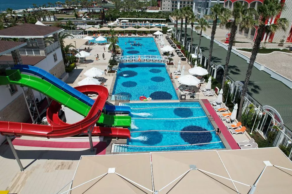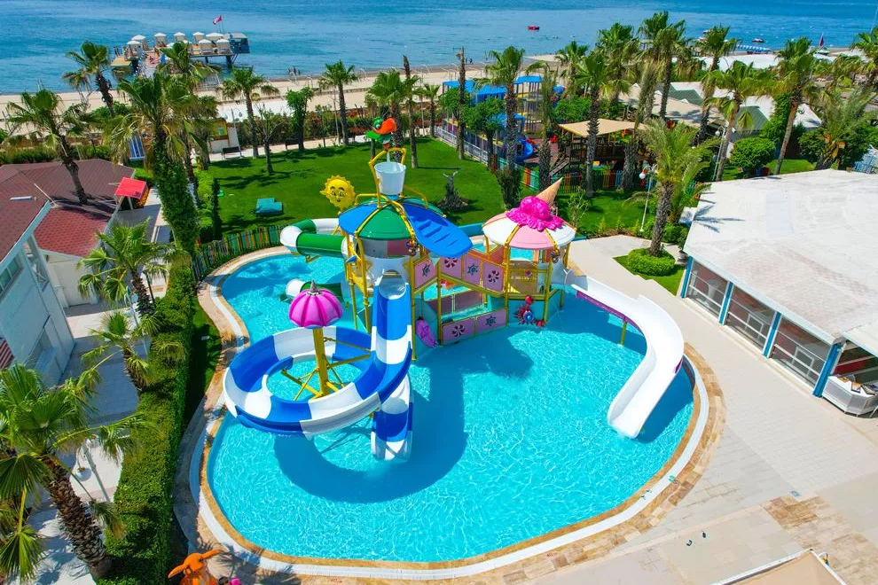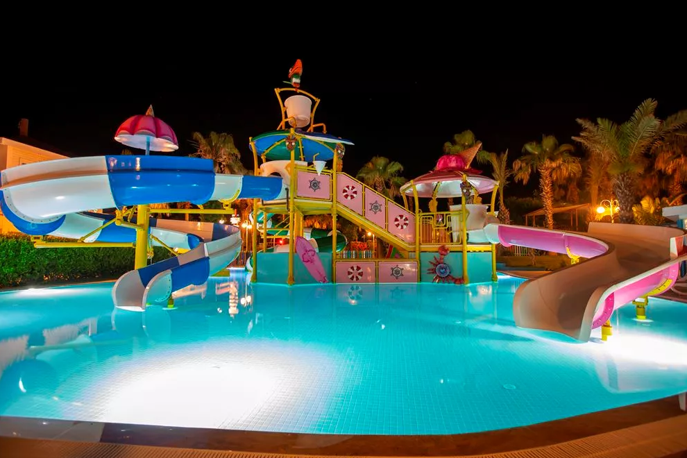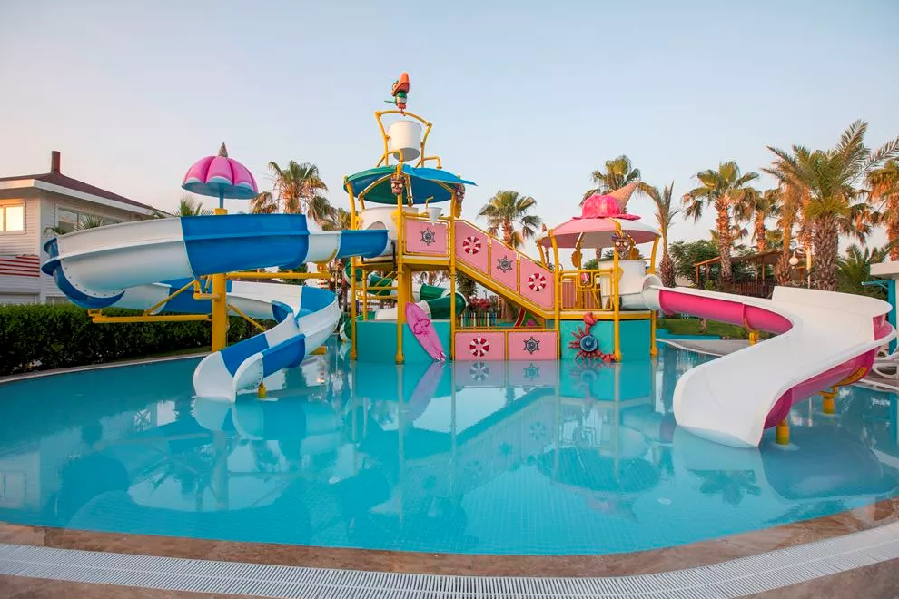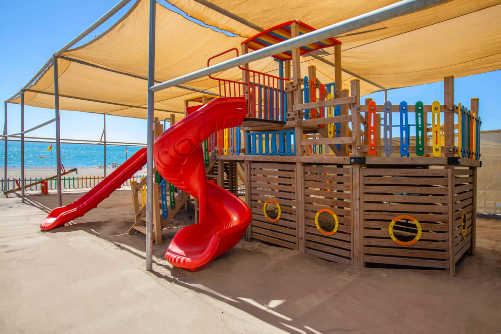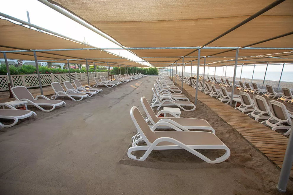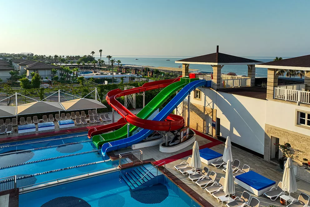 Собствен пясъчно-чакълест плаж, 2 открити басейна, 1 закрит, 3 водни пързалки. Чадъри, шезлонги и плажни кърпи на плажа и при басейна се ползват безплатно.
