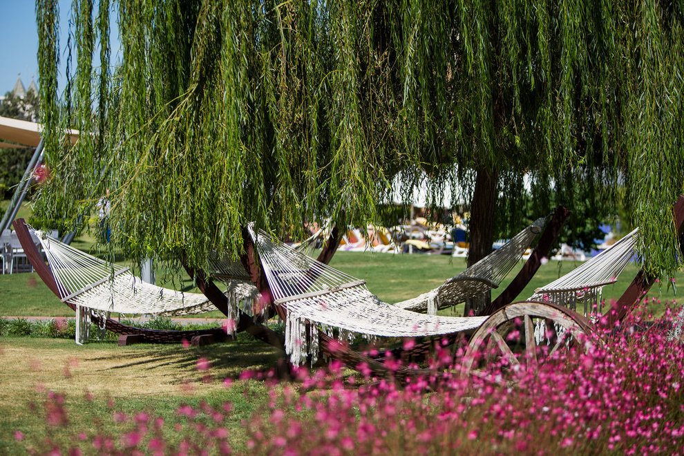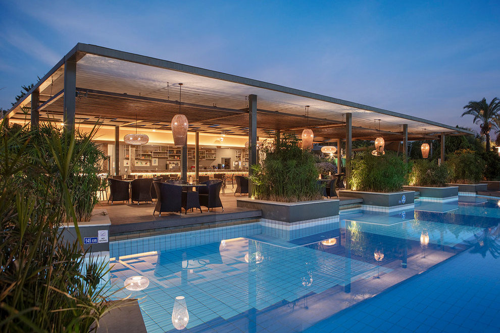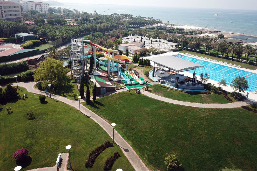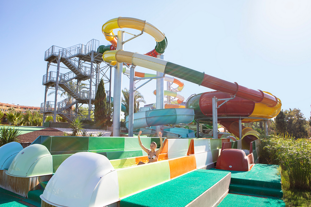 Собствен пясъчен плаж и четири открити басейна с четири водни пързалки.