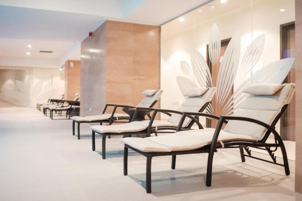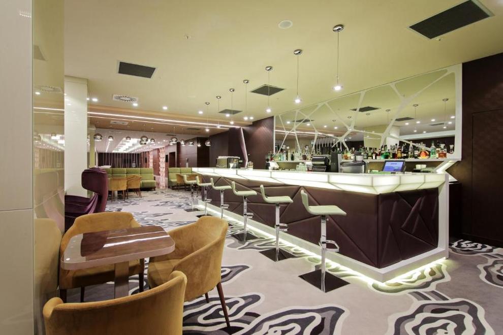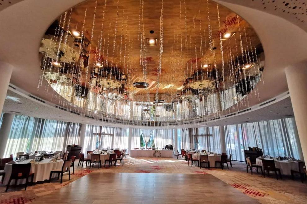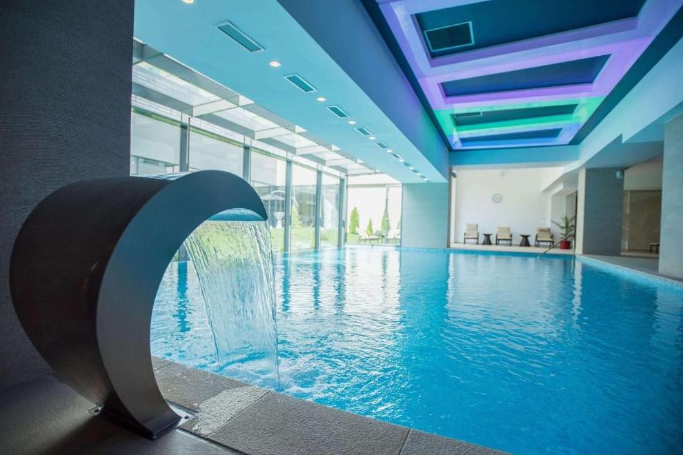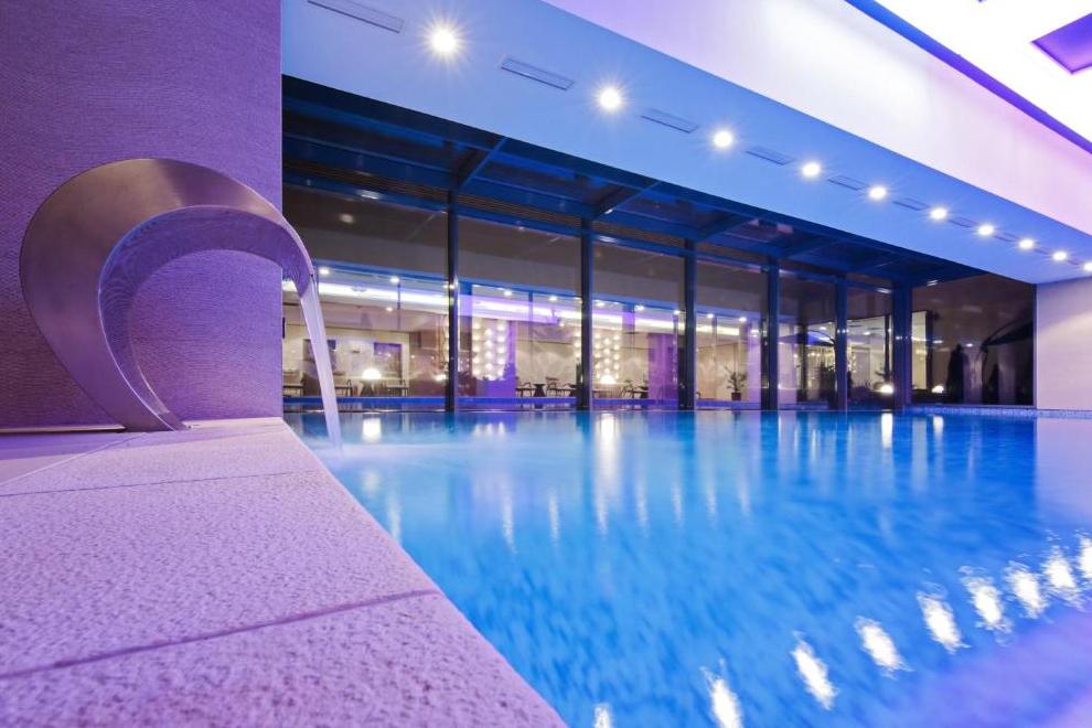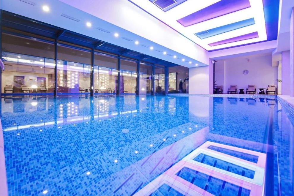 СПА и уелнес зона, фитнес зала и вътрешен басейн с цветни светлини. 5 заседателни зали.
