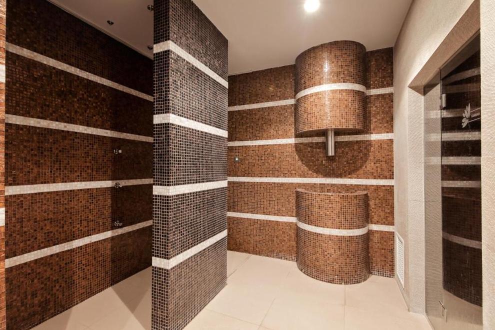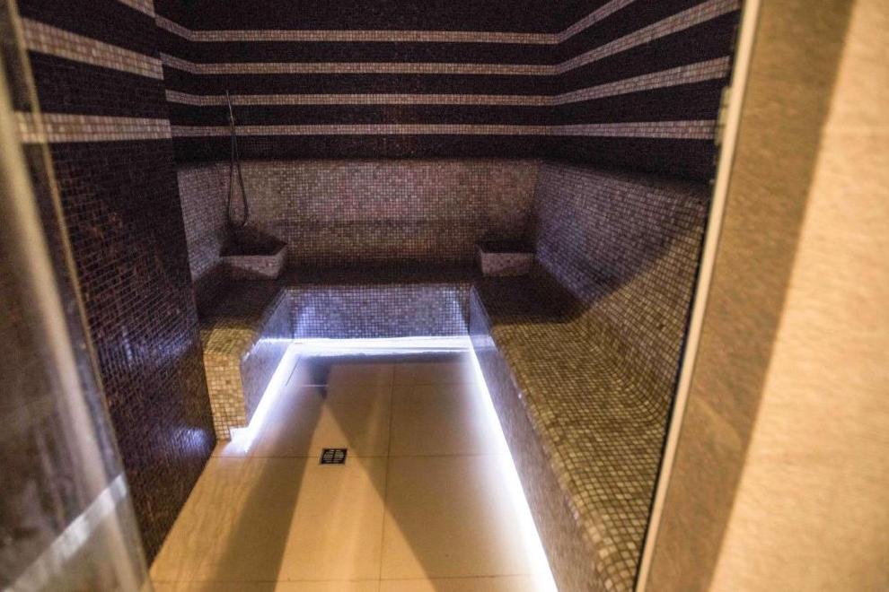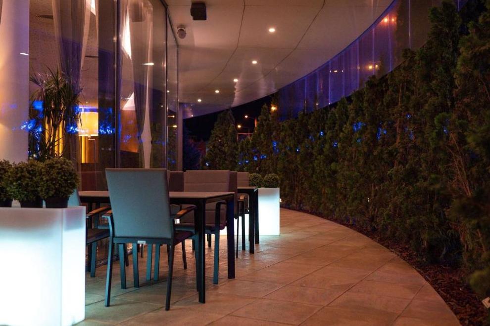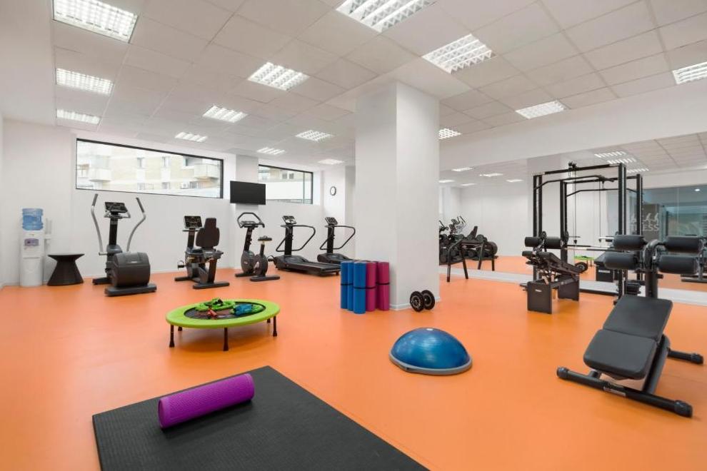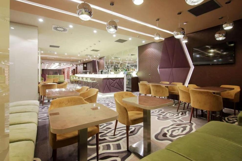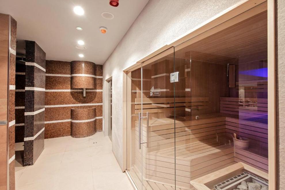 СПА и уелнес зона, фитнес зала и вътрешен басейн с цветни светлини. 5 заседателни зали.