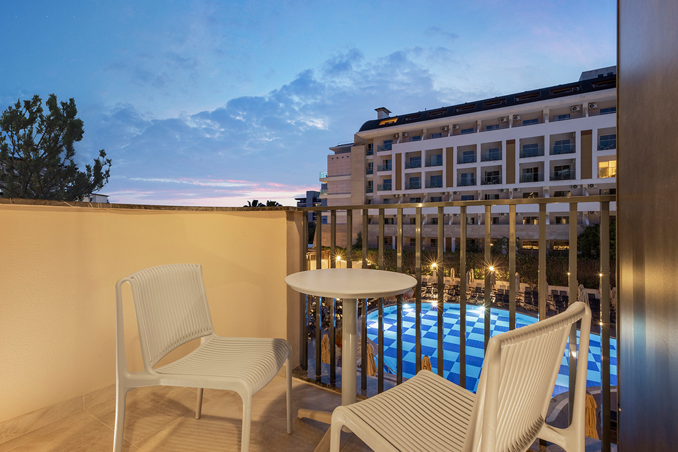 Deluxe Pool View Room с площ 18-24 кв.м, баня с душ кабина, балкон с маса и столове, с гледка към басейна, максимално настаняване 3 души. Стаите са реновирани 2023-2024 г.