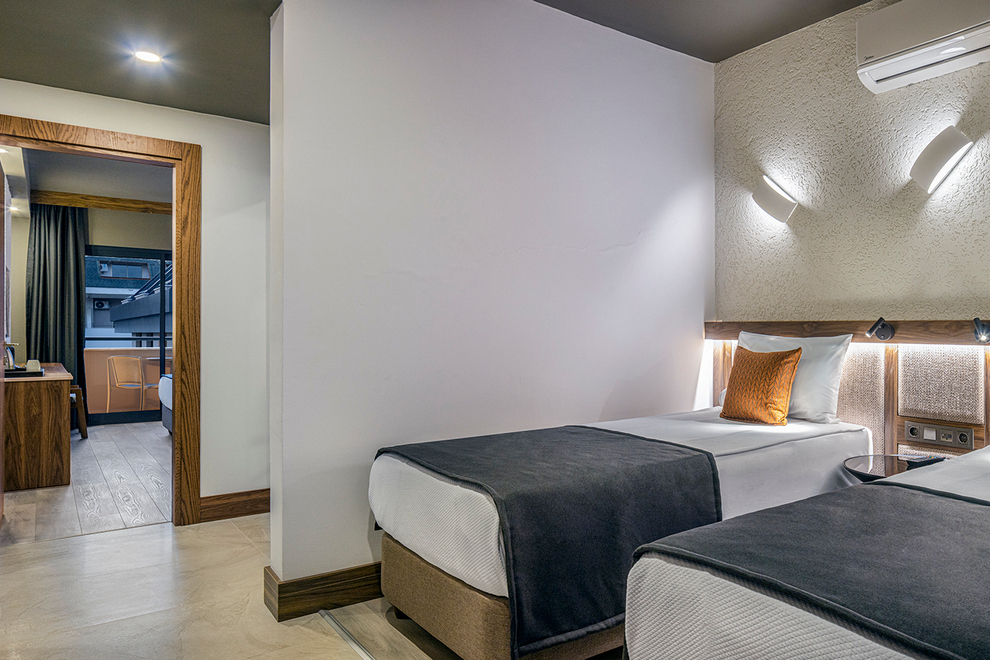 Deluxe Family Room с площ 32-48 кв., баня с душ кабина, балкон с маса и столове, максимално настаняване 4 възрастни или 2+2 деца. Стаите са реновирани 2023-2024 г.