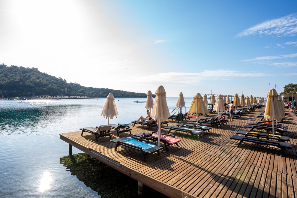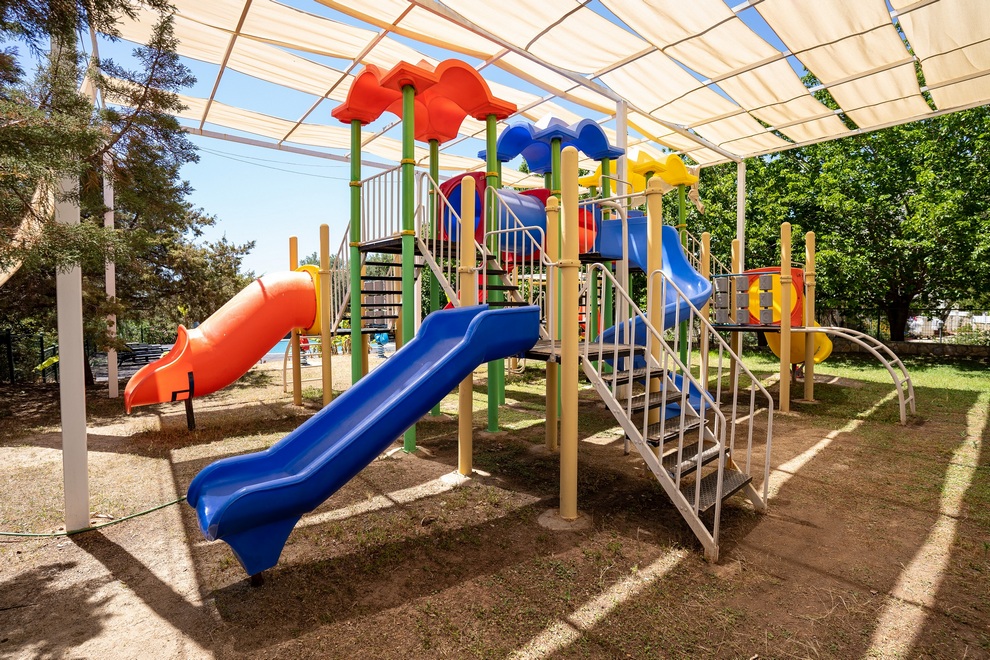 Собствен пясъчно-чакълест плаж, отличен със Син флаг и платформа. На разположение на гостите има 1 открит басейн с 5 водни пързалки и закрит басейн.