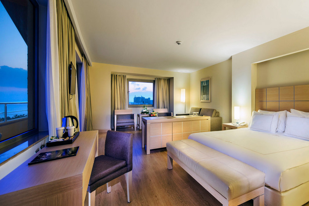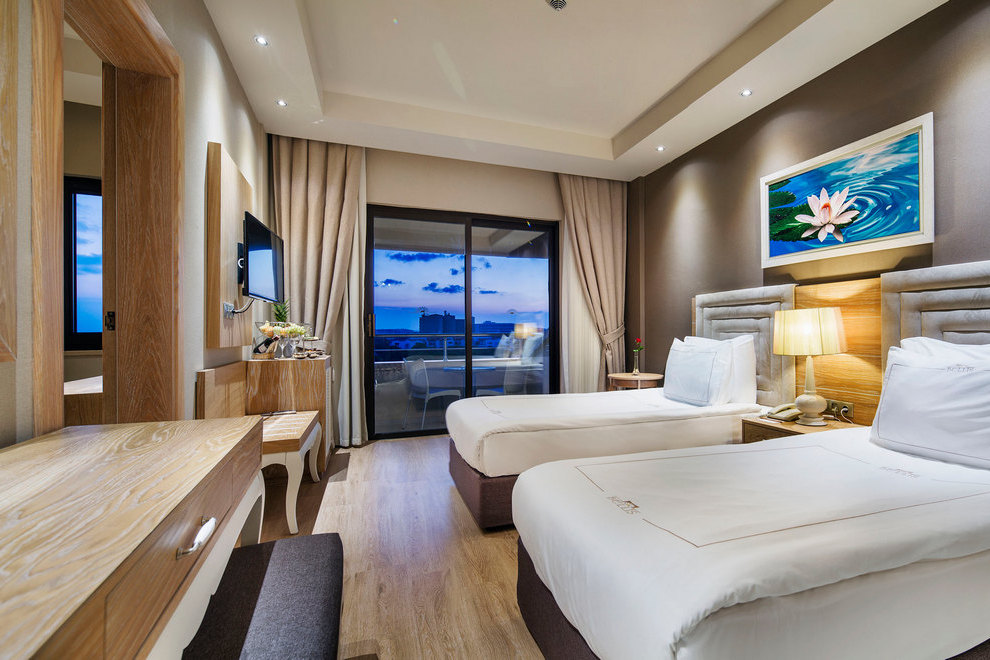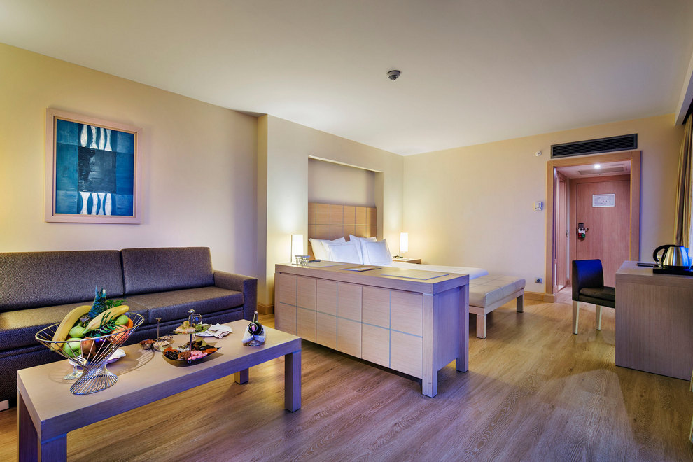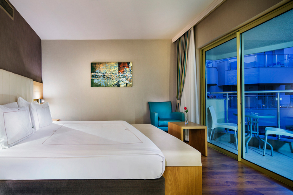 Стаи в Main Building: 244 Standard Room - изглед суша/ частично море/ директно море, площ 22 кв.м), 74 Junior Suite Sea View – едностайни, с изглед море, площ 35 кв.м, 19 Family Room - 2 спални с врата, площ 40 кв.м.