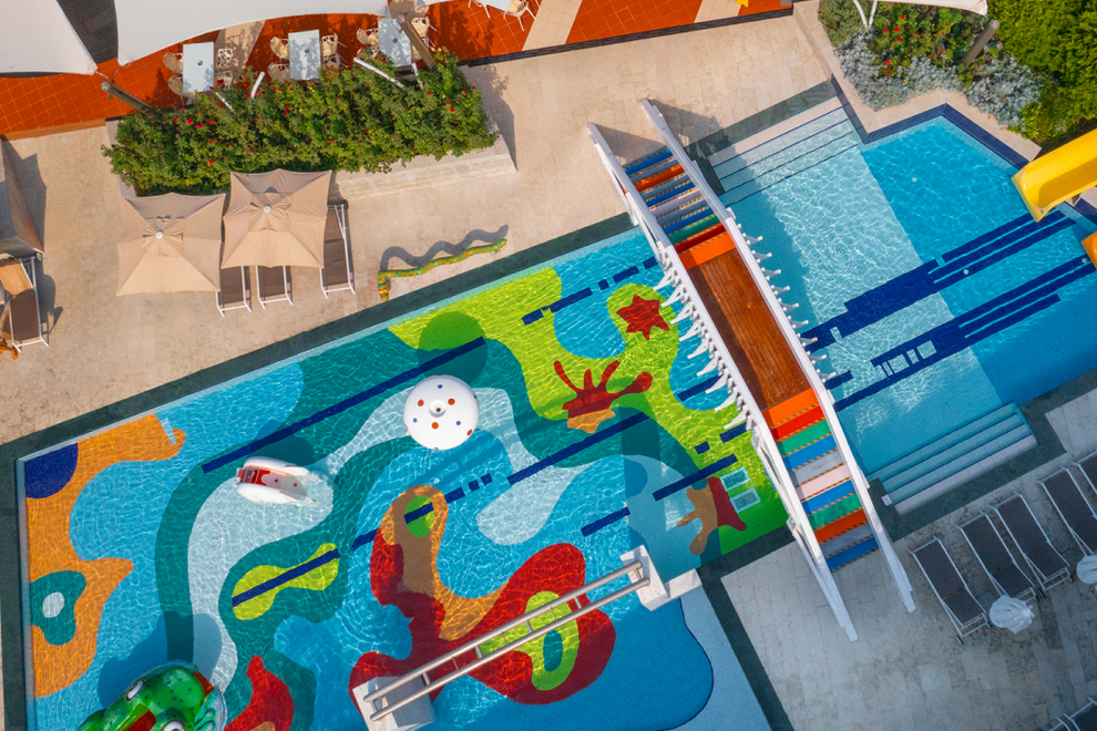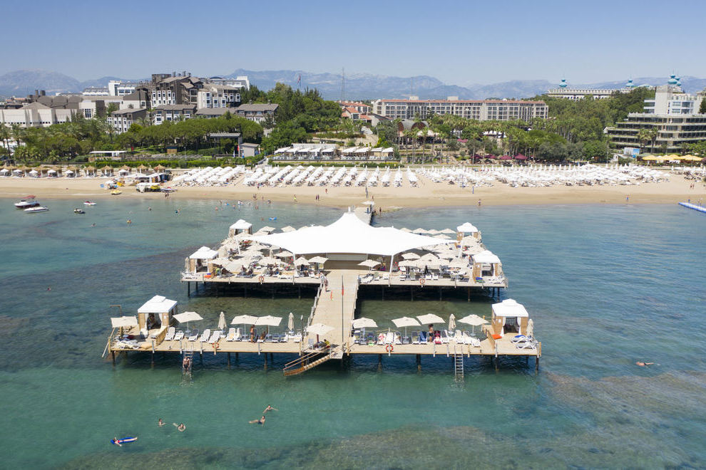 400 кв. метра собствен пясъчен плаж на 150 м от морето и кей, има безплатен автобус до там и обратно. На разположение на гостите има 3 открити неотопляеми басейна, единият от които е за възрастни 16+, 423, 461 и 212 кв.м, 1 закрит отопляем басейн (през зимния сезон), 84 кв.м. 2 водни пързалки за деца, работно време 10:00-12:30 ч./14:30-17:00 ч. Външните басейни и пързалки са затворени през зимния сезон.