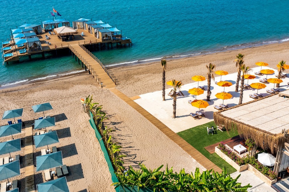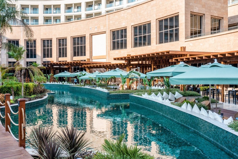 Хотелът разполага с 200-метров частен пясъчен плаж с безплатни чадъри и шезлонги. В луксозния комплекс има също обширна градина, детски басейн и открити басейни с няколко водни пързалки. 2 закрити басейна.