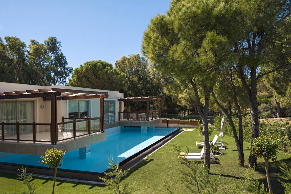 Golf Villa с 2 спални - 130 кв.м, 2 спални, обща площ 642 кв.м (138 кв.м вътрешна, 504 кв.м външна), всекидневна, тераса, 96 кв.м частен басейн, плажен павилион, сейф (безплатен), кафе машина Nespresso и кана, максибар и комплект закуски (безплатно), 2 тоалетни, 2 бани, халати за баня, тоалетни принадлежности Bvlgari, 42" LED телевизори, неограничен интернет достъп (безплатен).