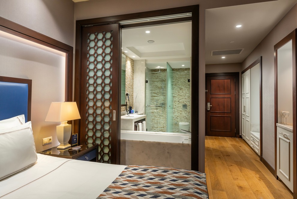 Swim Up Superior - разположена в основната сграда на Palazzo, с изглед към басейна, 1 спалня (френска), хол с разтегателен диван (може да се използва за двама, когато е отворен), тераса с директен достъп до басейна, 42-инчов LED телевизор, сейф, кафемашина Nespresso и кана, минибар и комплект закуски (безплатни), баня с вана, душ, халат, тоалетни принадлежности, балкон, неогранчен интернет достъп.