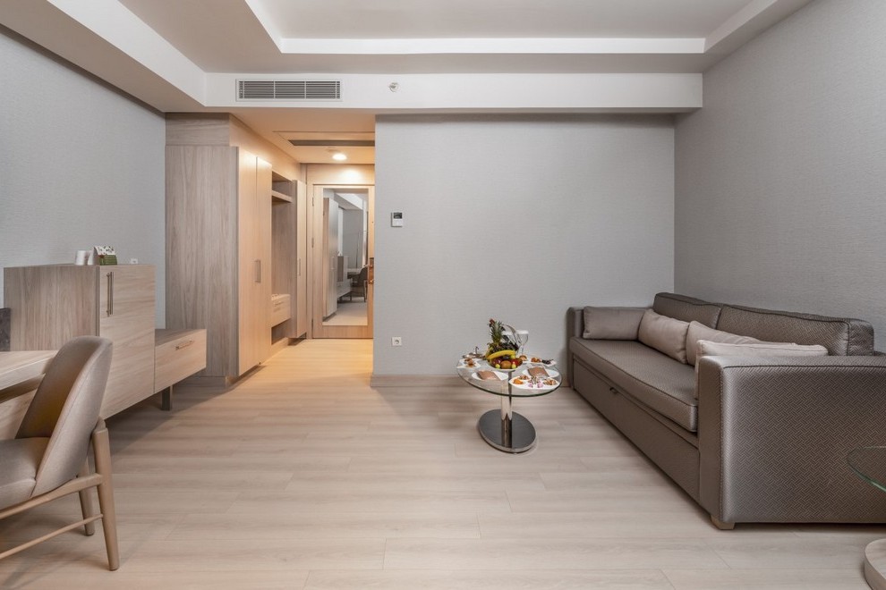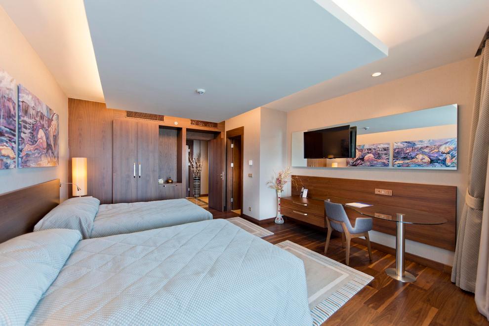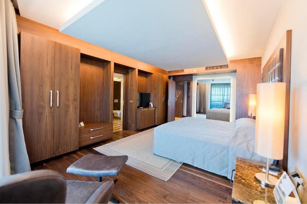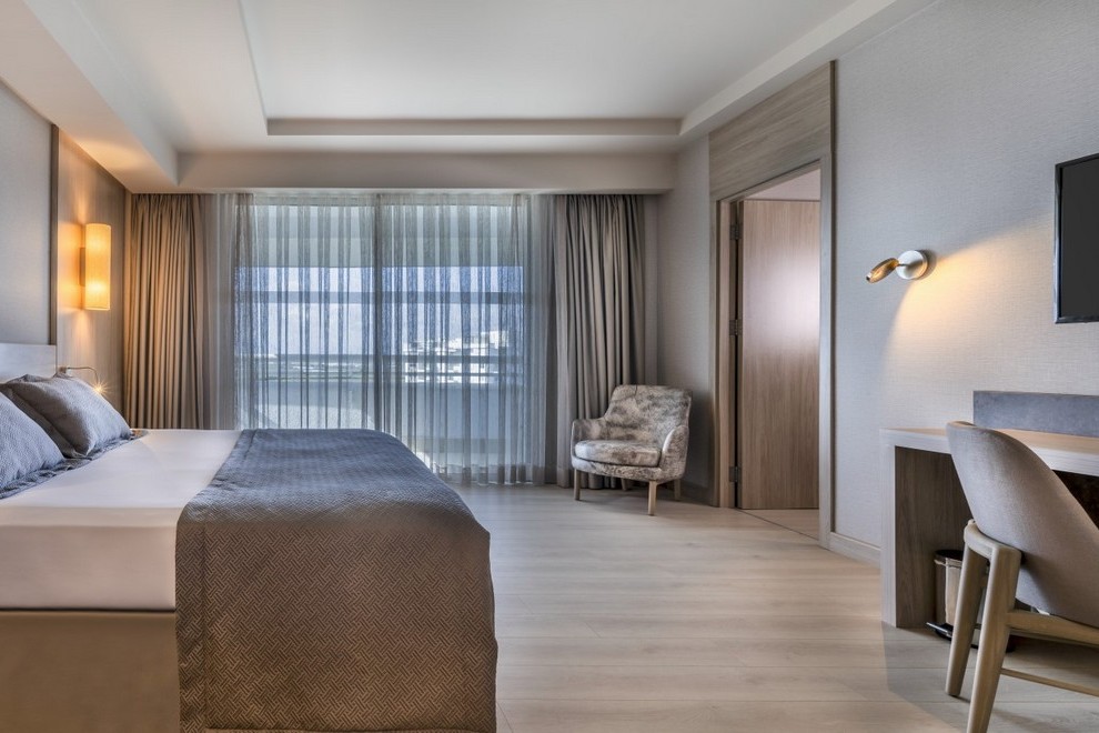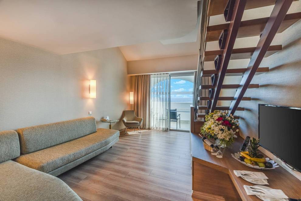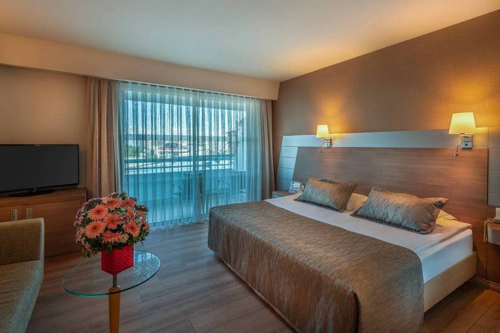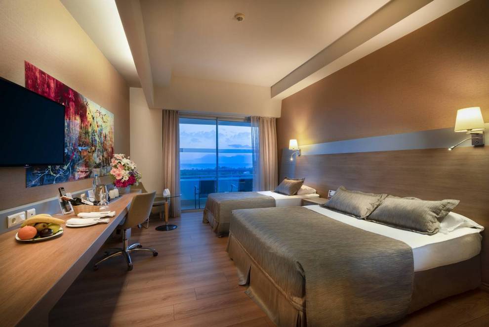 Хотелът се състои от една 7-етажта сграда (5 асансьора), в която са разпределени 401 климатизирани стаи: 6 Deluxe Family Suite (55 кв.м), 19 Deluxe Junior Suite (43 кв.м), 16 Deluxe Family Doublex Room (47 кв.м), 2 Deluxe Royal Suite (81 кв.м), 4 Deluxe Grand Suite (61 кв.м), 67 Deluxe Land View (28 кв.м) и 263 Deluxe Sea View (28 кв.м). Всички стаи са оборудвани с телефон, сателитна телевизия, минибар, машина за кафе Nespresso, сейф, ютия и дъска за гладене, баня с вана/душ, сешоар, безплатни тоалетни принадлежности, кантар, Wi-Fi . Почистване на стаите - всеки ден. Смяна на спално бельо - на всеки два дни.