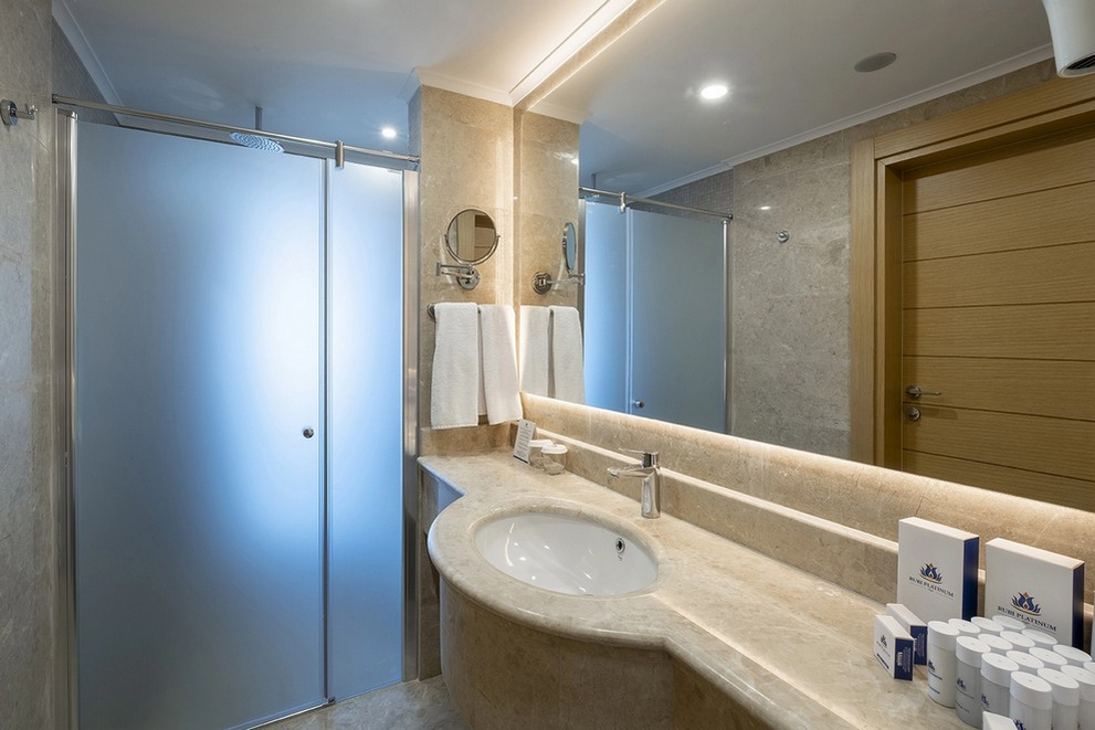 11 Superior Suite - 2 спални, 2 бани, площ 73 кв.м, максимално настаняване 4+1 бебе. Бебешко креватче, възглавница, бебешко спално бельо, бебешко одеяло, комплект пике, бебешка вана и гърне се предоставят по заявка на семействата. Стаята разполага с тераса, от която можете да се насладите на лукса, комфорта и великолепната гледка с 1 джакузи и зона за сядане.