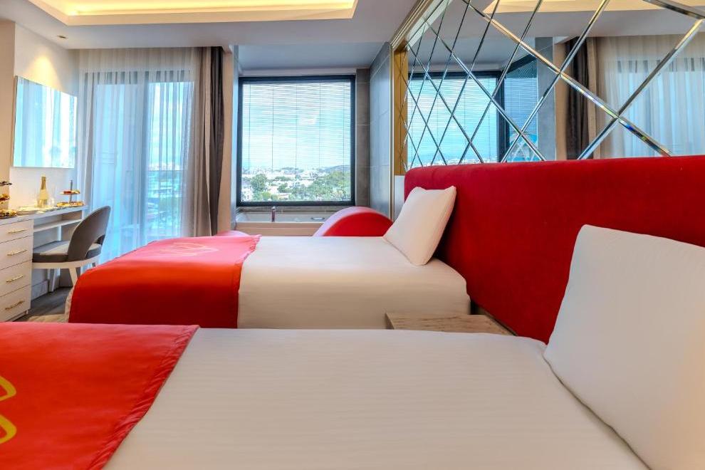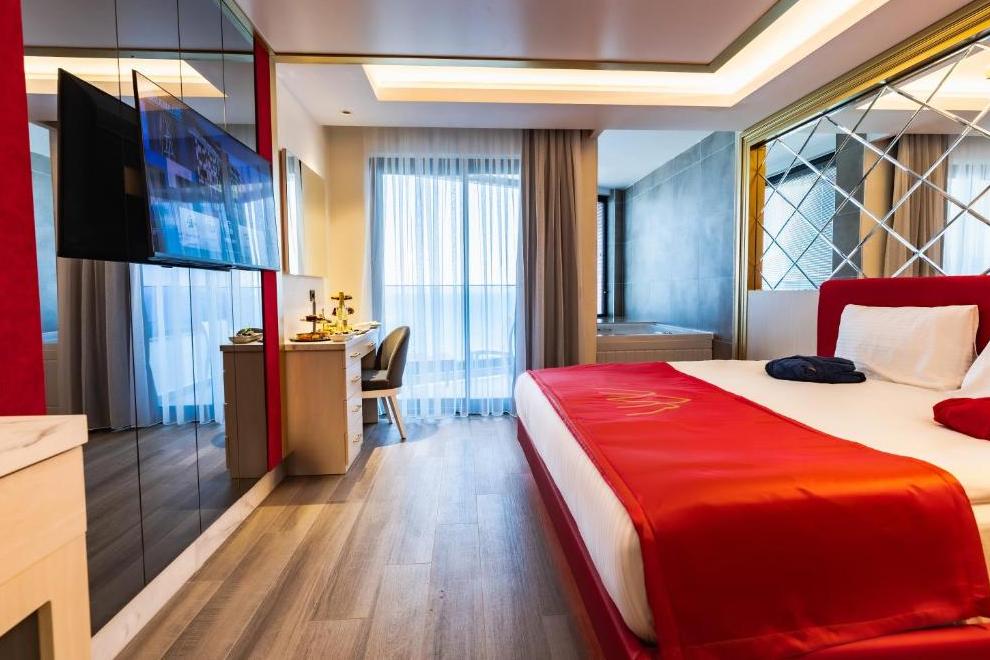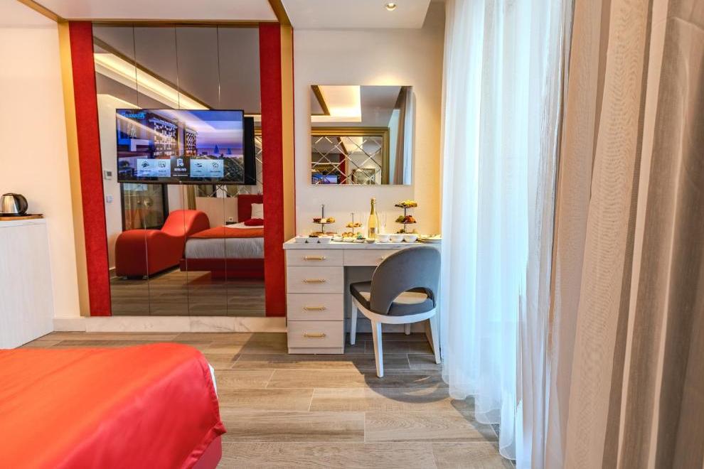 Всички стаи са оборудвани с климатик, LED телевизор, телефон, тантра фотьойл, минибар (вода, безалкохолни напитки, бира, шоколадов десерт, ядки – безплатно с ежедневно зареждане), сет за кафе/чай, сейф (безплатен), баня с душ и джакузи, сешоар, балкон с масичка. При настаняване плато за кетъринг (локум, баклава, ядки, сушени плодове и шампанско при настаняване в Deluxe Suite Partial Sea View.