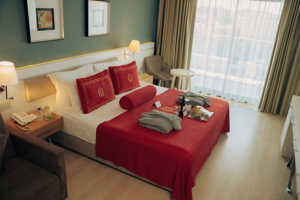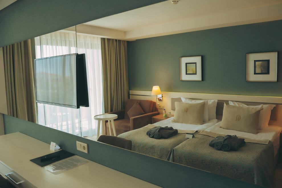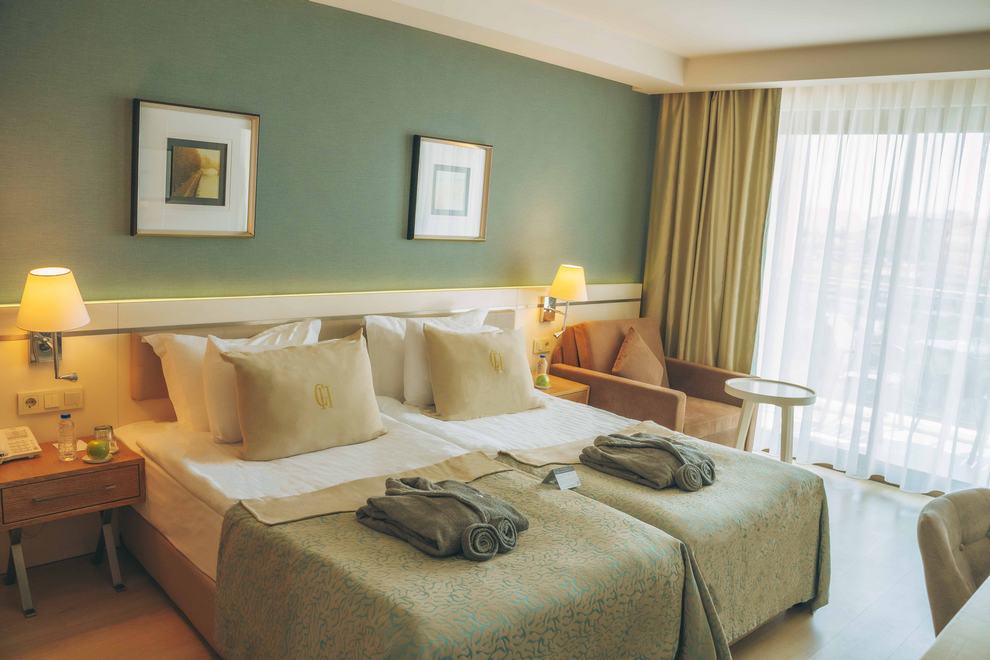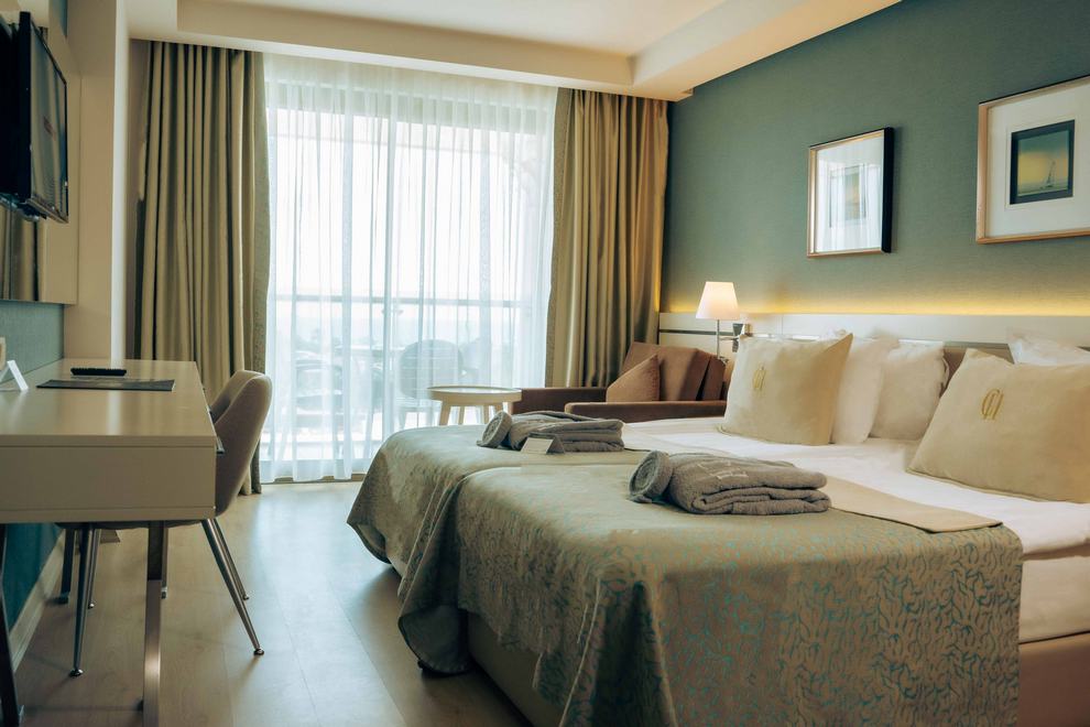Хотелът се състои от една 9-етажна сграда (има асансьори), в която са разпределени 382 климатизирани стаи, от които Standard Room Sea View (22 кв.м), Standard Room Land View (22 кв.м), Standard Room Side Sea View (22 кв.м), Family Room 1 Bathroom (33 кв.м), Family Room 2 Bathroom (50 кв.м). Те са оборудвани с телевизор, телефон, минибар, сейф, баня с вана/душ, балкон, Wi-Fi. Почистване на стаите и смяна на кърпите – всеки ден, смяна на спалното бельо – 2 пъти седмично.