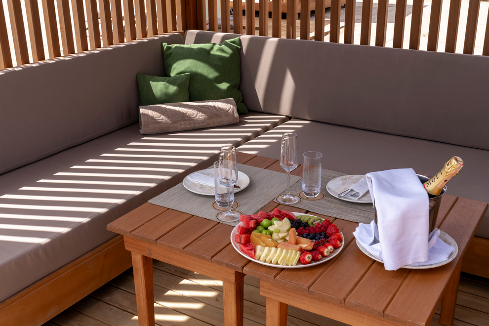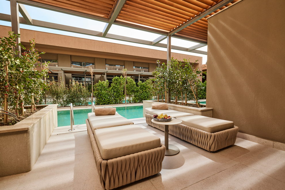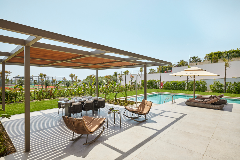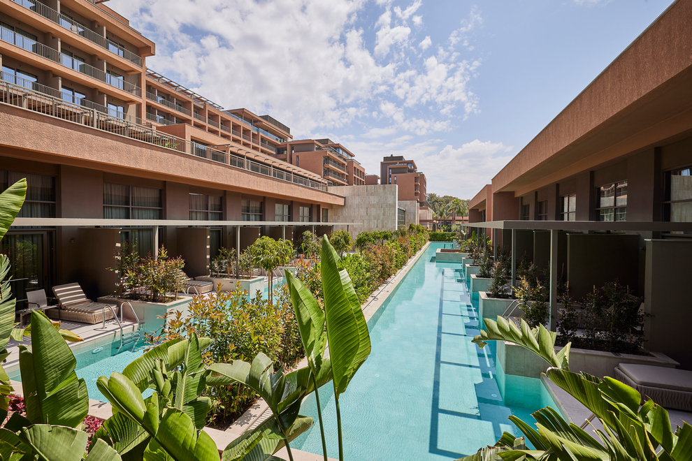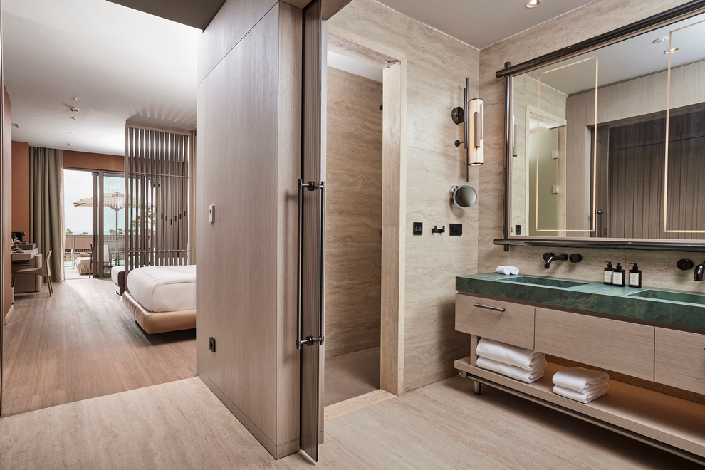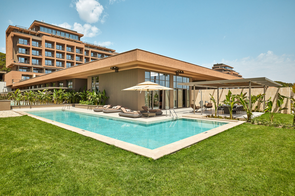 Fabulous Suite с гледка басейн/ градина, 1 спалня и 1 хол (1 двойно легло и кът за сядане), 2 бани с душ/тоалетна, директен достъп до частен басейн на терасата (27 кв.м), морска страна, площ 100 кв.м, максимален капацитет 4+1 дете.