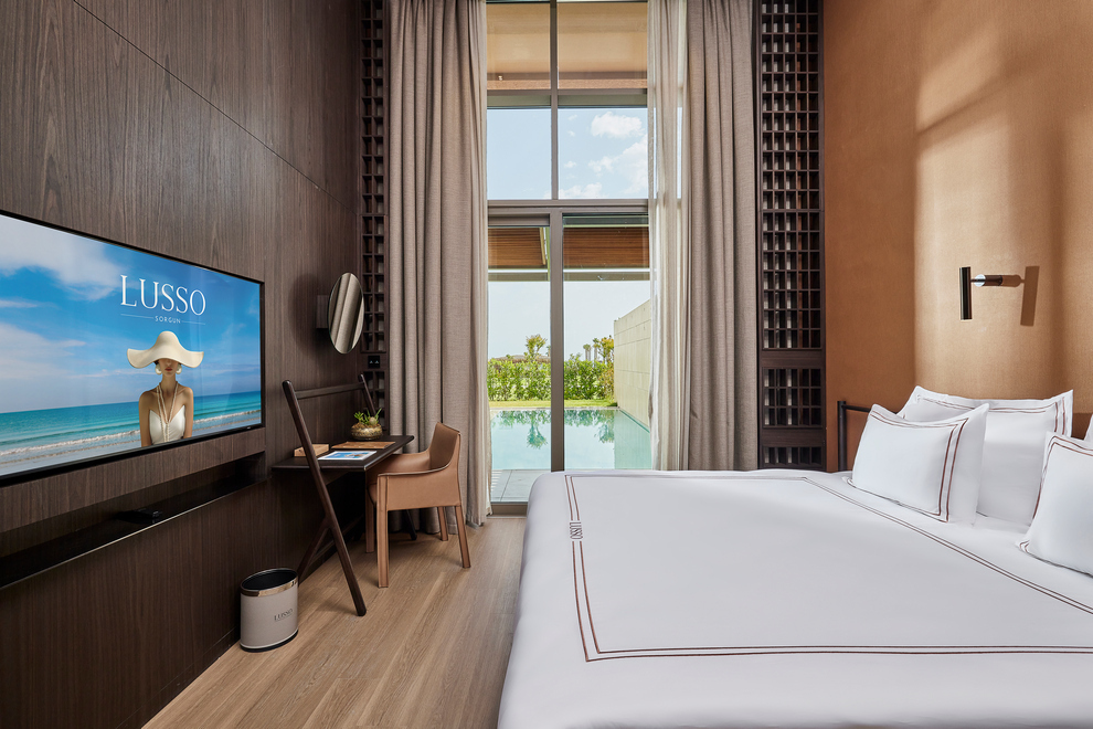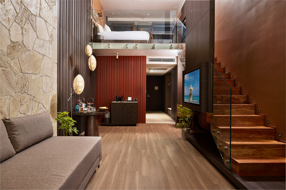 Dublex Lagoon Suite с гледка градина/ басейн, дуплекс стая с 1 спалня и 1 хол (1 двойно легло, диван), 2 бани с душ/тоалетна, директен достъп до споделения басейн от терасата, площ 81 кв.м, максимален капацитет 3+1 дете.
