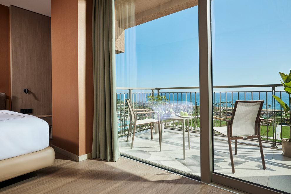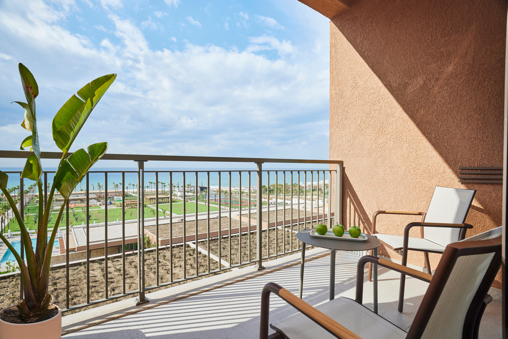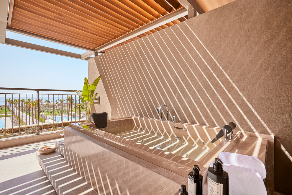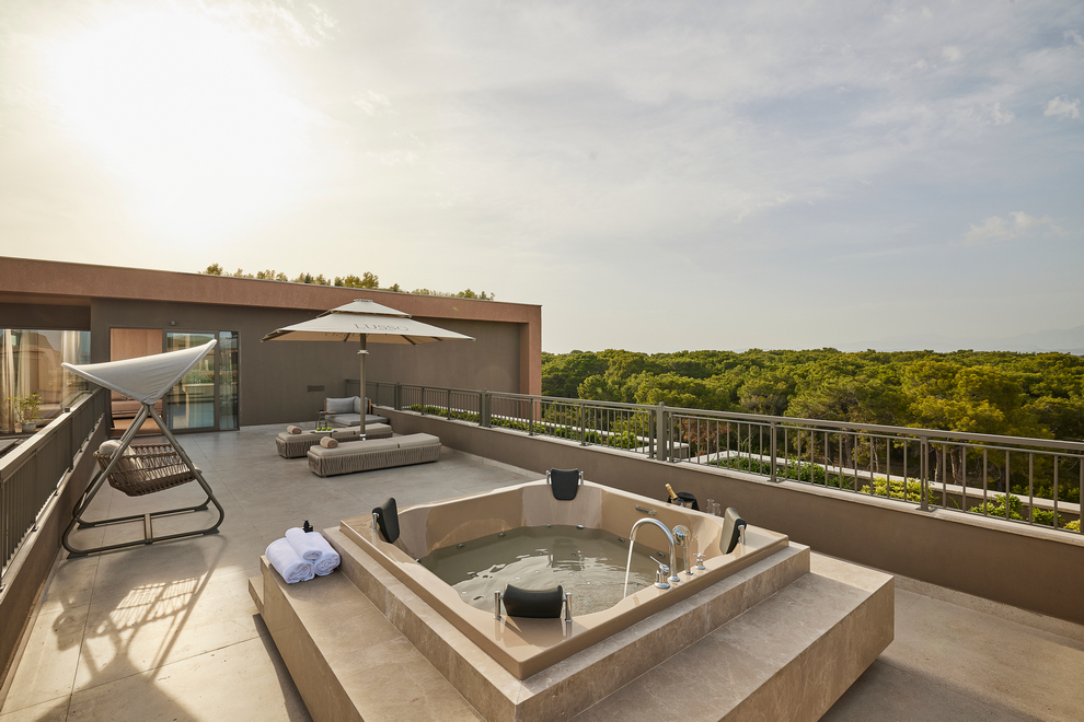 Superior Standard Room with Jacuzzi (с джакузи на терасата), с гледка море, 1 спалня (1 двойно легло и 1 единично легло), баня с душ, директен достъп до джакузи на терасата (2–4 кв.м), площ 49 кв.м, максимално настаняване 3+1 дете.