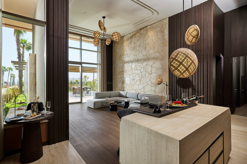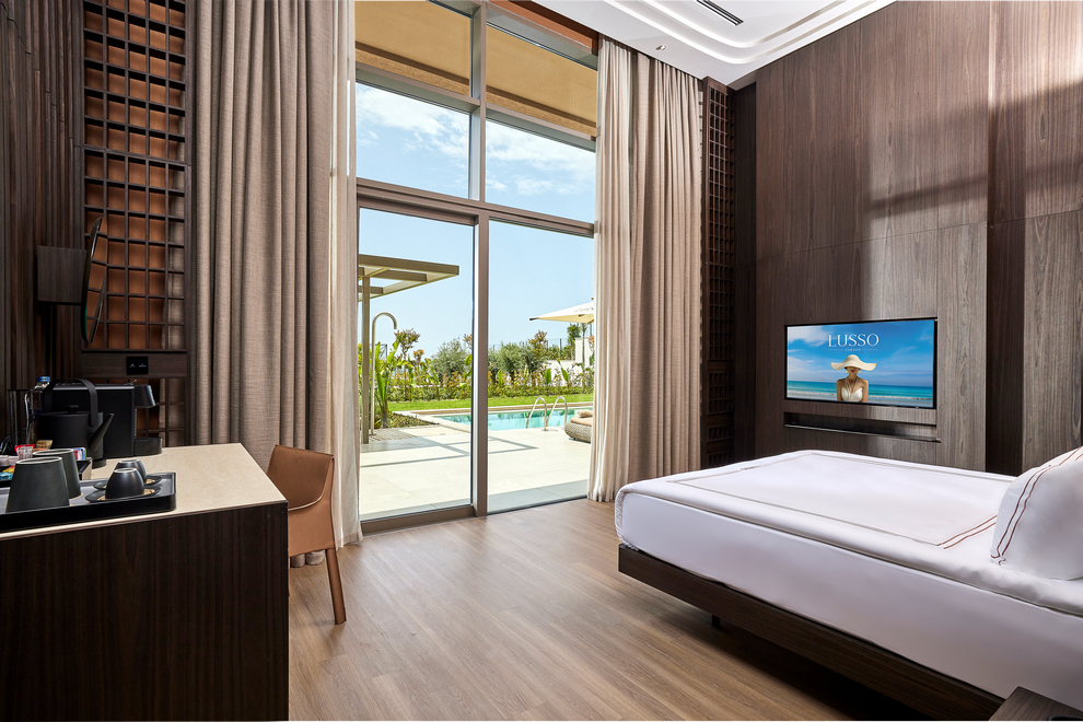 Presidental Suite с гледка море, басейн и градина, 3 спални и 1 хол (1 двойно легло и 4 единични легла), 3 бани с душ/тоалетна, директен достъп до частен басейн на терасата (90 кв.м), кът за сядане, площ 290 кв.м, максимален капацитет 4+1 дете.