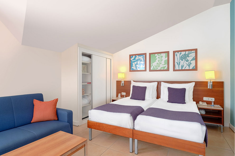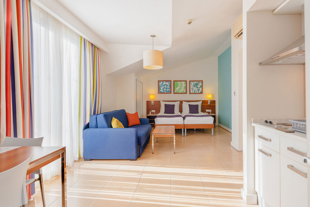 Хотелът посреща гостите си в 254 климатизирани стаи, разположени в 4- и 5-етажни сгради, от които 4 Junior Suite (спалня, всекидневна с кухненски бокс, баня - 40 кв.м), 230 Suite (спалня, всекидневна с кухненски бокс, разделени с плъзгаща врата, 1 баня - 45 кв.м), 10 Grand Suite (2 спални, всекидневна с кухненски бокс, 1 баня - 53 кв.м). Всички стаи имат телевизор, телефон, сейф (безплатен). В кухненския бокс има микровълнова фурна, хладилник, тостер и фурна. Баня с душ/вана, сешоар. Почистване на стаите и смяна на кърпите - всеки ден, смяна на спалното бельо – 2 пъти седмично.