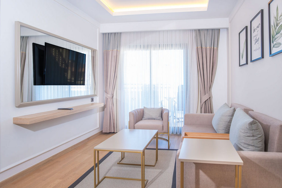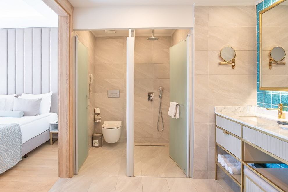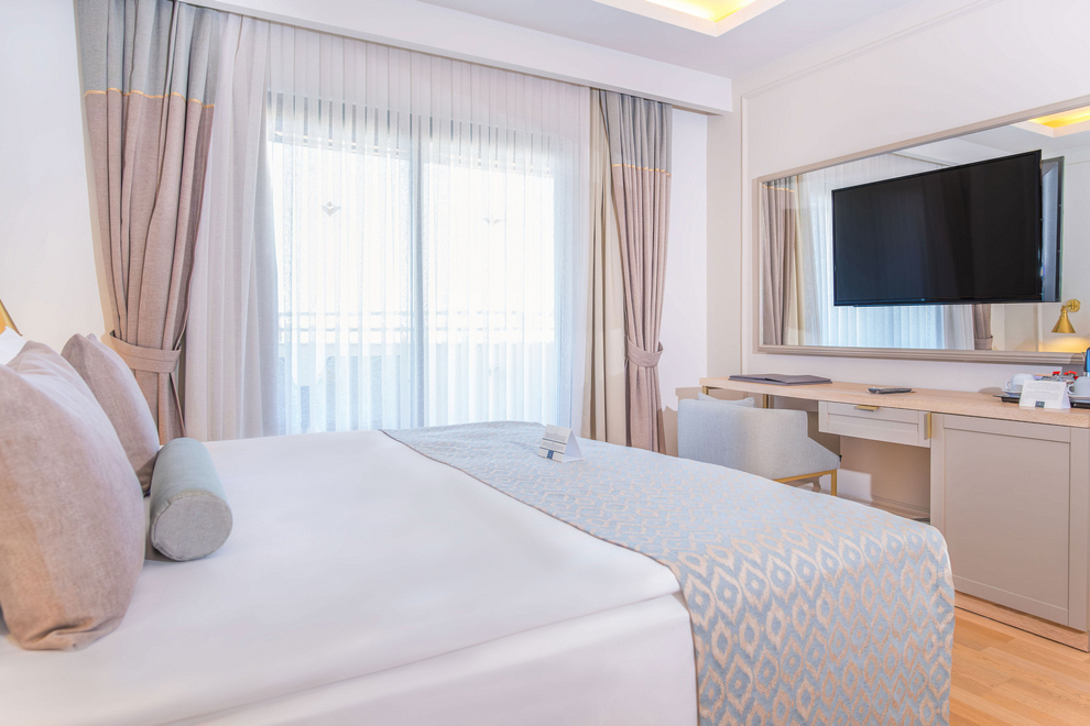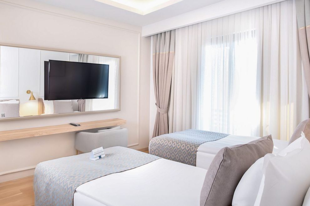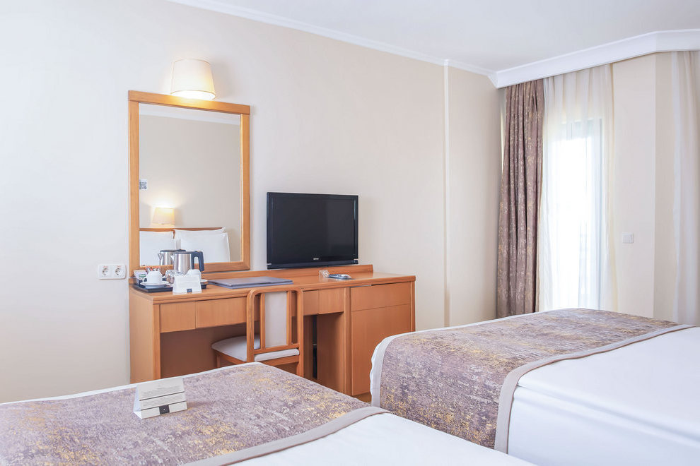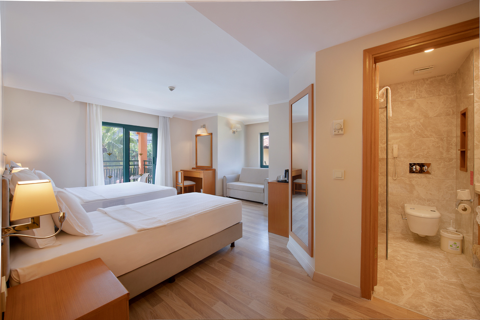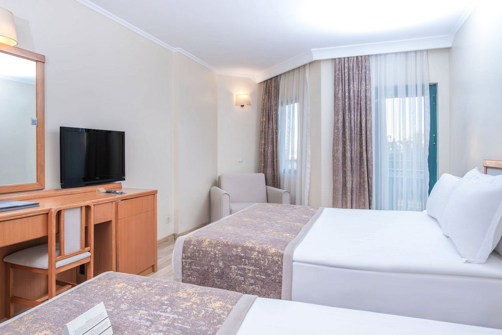Хотелът се състои от 1 основна сграда (6 етажа, 2 асансьора) и 9 допълнителни сгради (3 етажа, без асансьор), в които са разпределени 319 климатизирани стаи. От които стаи Main Building: Standard room (28 кв.м), Standard room Sea view (с изглед море - 28 кв.м), 95 Hotel Family room (2 спални, 1 баня - 43 кв.м), Junior Suite room (1 спалня, всекидневна, 2 бани - 45 кв.м), Suite Land view room (с изглед суша, 1 спалня, всекидневна, 2 бани - 40 кв.м), Suite Sea view (с изглед море, 1 спалня, всекидневна, 1 баня - 50 кв.м), Suite with Sauna & Jacuzzi* (1 спалня, 2 бани, джакузи – 75 кв.м), King Suite (2 спални, всекидневна, 1 баня – 75 кв.м), Handicapped room (пригодени за хора с ограничена подвижност - 28 кв.м). Стаи Villas: Family room Villa (1 спалня + мека мебел, 1 баня, 1 сауна + джакузи - 75 кв.м). Стаите са оборудвани с телевизор, телефон, сет за чай/кафе, минибар (безплатен), сейф (безплатен), баня с душ, сешоар, козметичен сет за баня. Почистване на стаите и смяна на кърпите – всеки ден, смяна на спалното бельо – 2 пъти в седмицата.