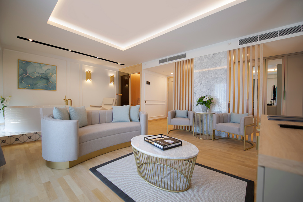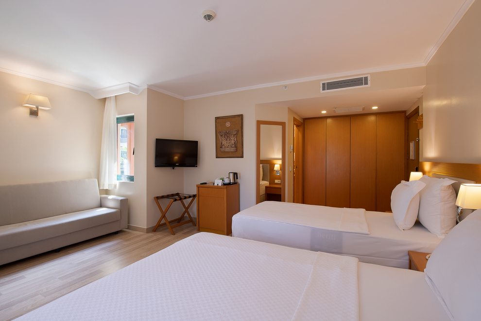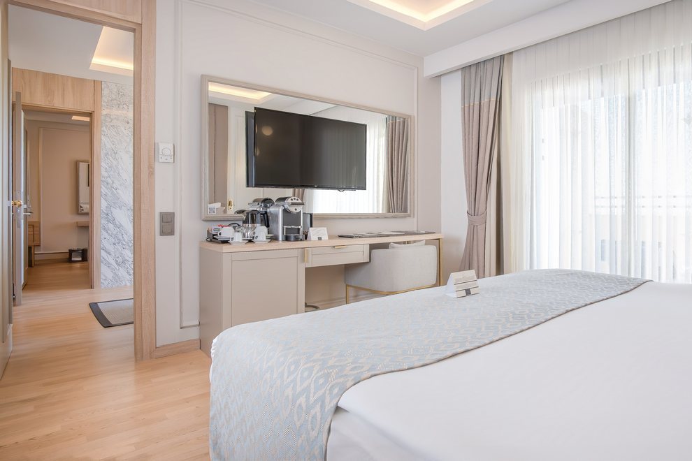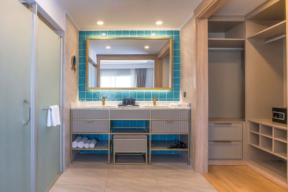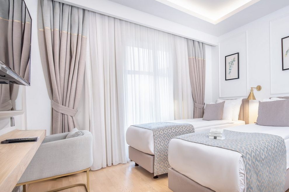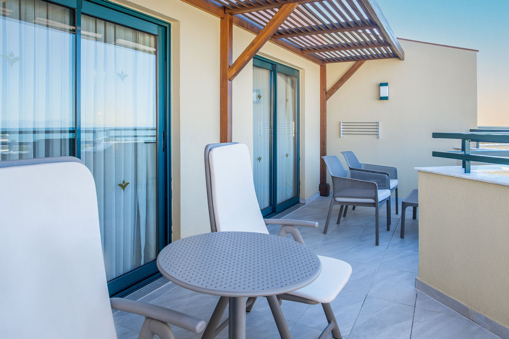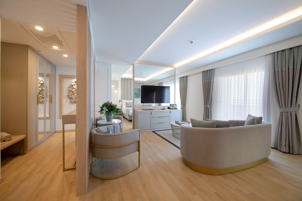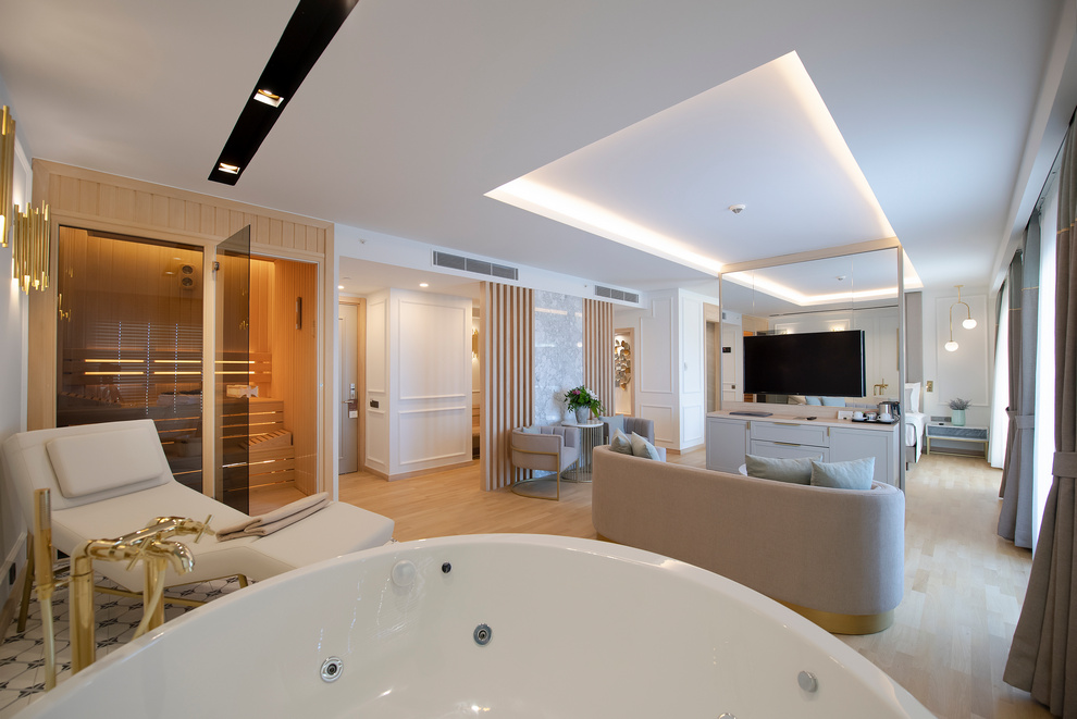 Хотелът се състои от 1 основна сграда (6 етажа, 2 асансьора) и 9 допълнителни сгради (3 етажа, без асансьор), в които са разпределени 319 климатизирани стаи. От които стаи Main Building: Standard room (28 кв.м), Standard room Sea view (с изглед море - 28 кв.м), 95 Hotel Family room (2 спални, 1 баня - 43 кв.м), Junior Suite room (1 спалня, всекидневна, 2 бани - 45 кв.м), Suite Land view room (с изглед суша, 1 спалня, всекидневна, 2 бани - 40 кв.м), Suite Sea view (с изглед море, 1 спалня, всекидневна, 1 баня - 50 кв.м), Suite with Sauna & Jacuzzi* (1 спалня, 2 бани, джакузи – 75 кв.м), King Suite (2 спални, всекидневна, 1 баня – 75 кв.м), Handicapped room (пригодени за хора с ограничена подвижност - 28 кв.м). Стаи Villas: Family room Villa (1 спалня + мека мебел, 1 баня, 1 сауна + джакузи - 75 кв.м). Стаите са оборудвани с телевизор, телефон, сет за чай/кафе, минибар (безплатен), сейф (безплатен), баня с душ, сешоар, козметичен сет за баня. Почистване на стаите и смяна на кърпите – всеки ден, смяна на спалното бельо – 2 пъти в седмицата.