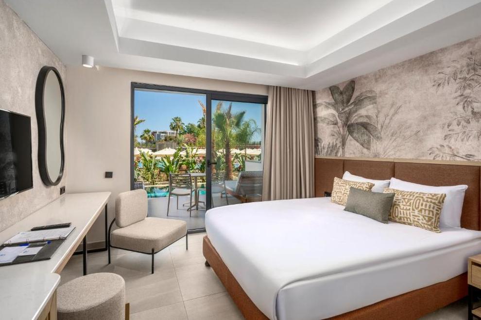 Хотелът се състои от една основна 6 етажна сграда, в която са разпределени 309 климатизирани стаи, от които Standard Room (30 кв.м) 1 двойно + 1 единично легло, баня (душ-тоалетна), балкон, изглед – градина/земя, басейн или море; Standard Swim-Up Room (25 кв.м), Двойно легло, баня (душ-тоалетна), балкон с връзка към частен басейн, изглед: към басейна; Standard Jacuzzi Room (30 кв.м) двойно легло, баня (душ-тоалетна), балкон с хидромасажна вана, изглед: към градина/земя или море; Family Room (35кв.м) 2 спални (1 двойно + 3 единични легла) балкон, баня (душ-тоалетна), изглед: към градина/земя или басейна. Всички стаи са оборудвани с телефон, LCD TV-сателитно предаване, музикални програми, минибар (минерална вода, 2 бутилки бира, безалкохолни напитки, плодов сок, чипс), сейф, сет за приготвяне на чай /кафе, баня, сешоар, халати и чехли, продукти за грижа, огледало за грим, Wi-Fi, балкон.
