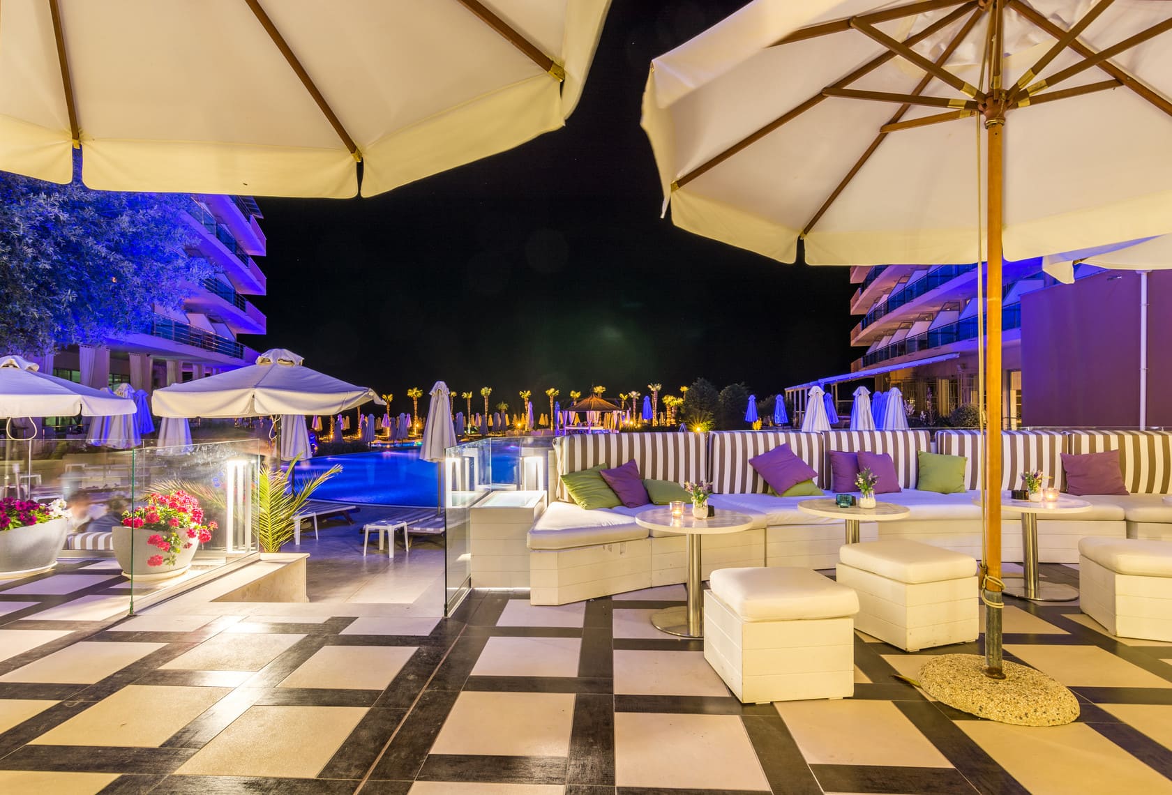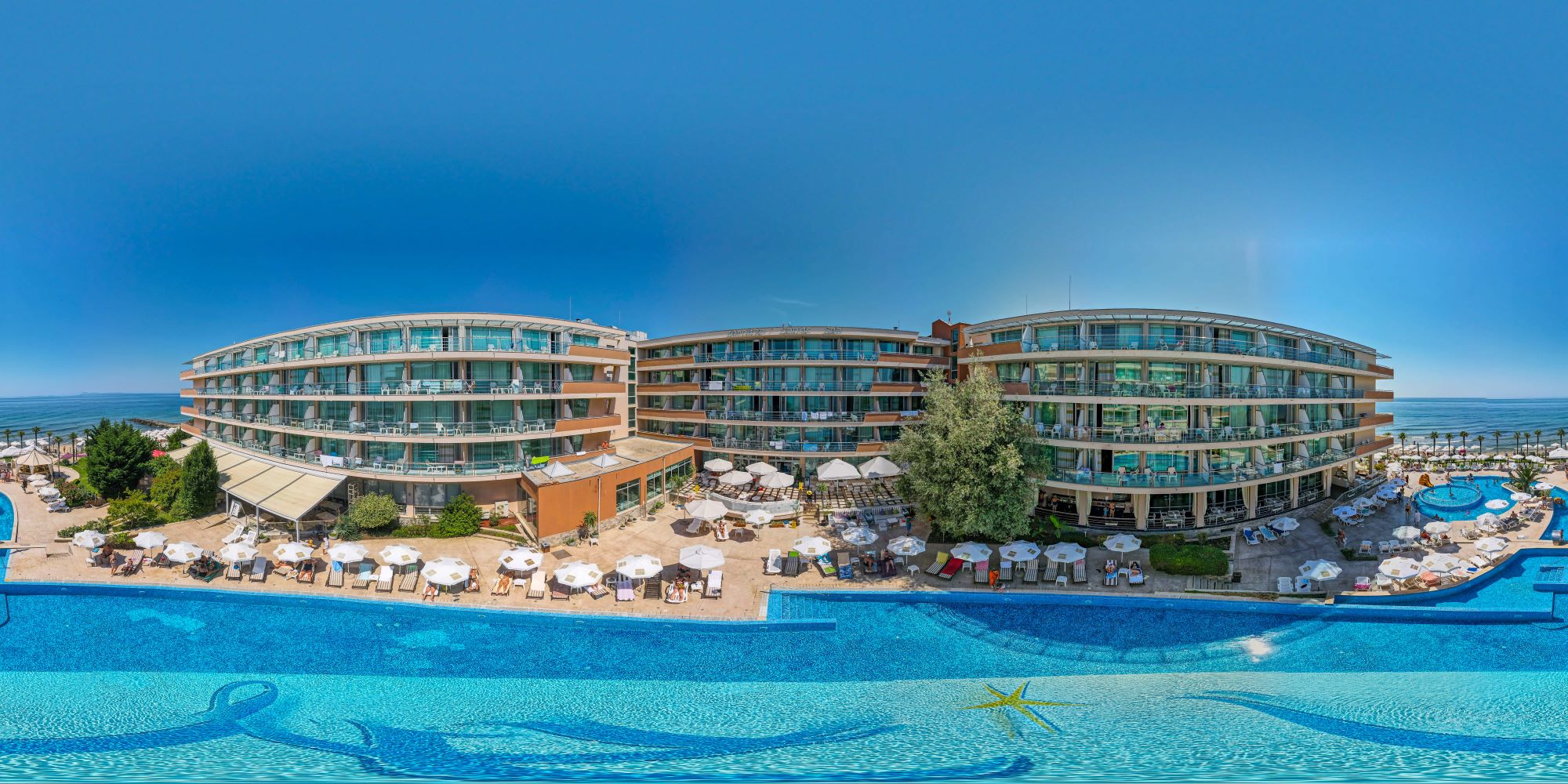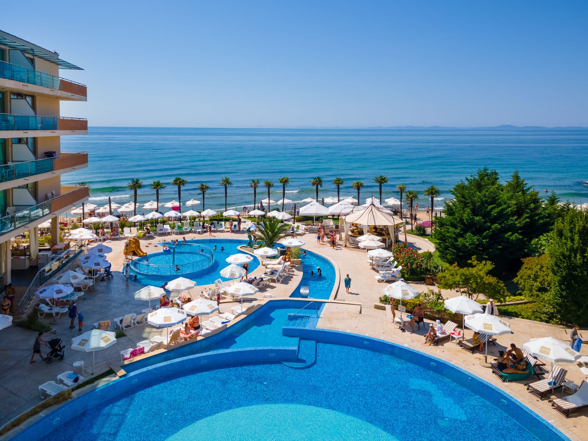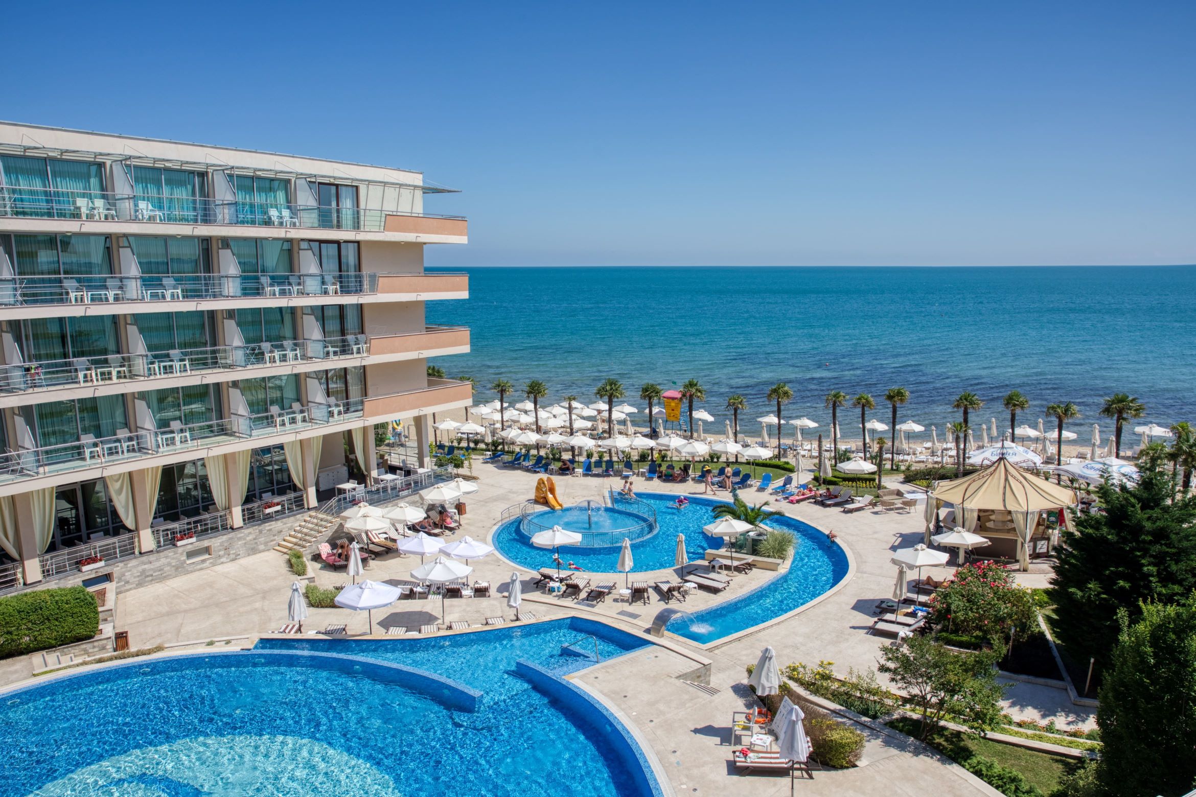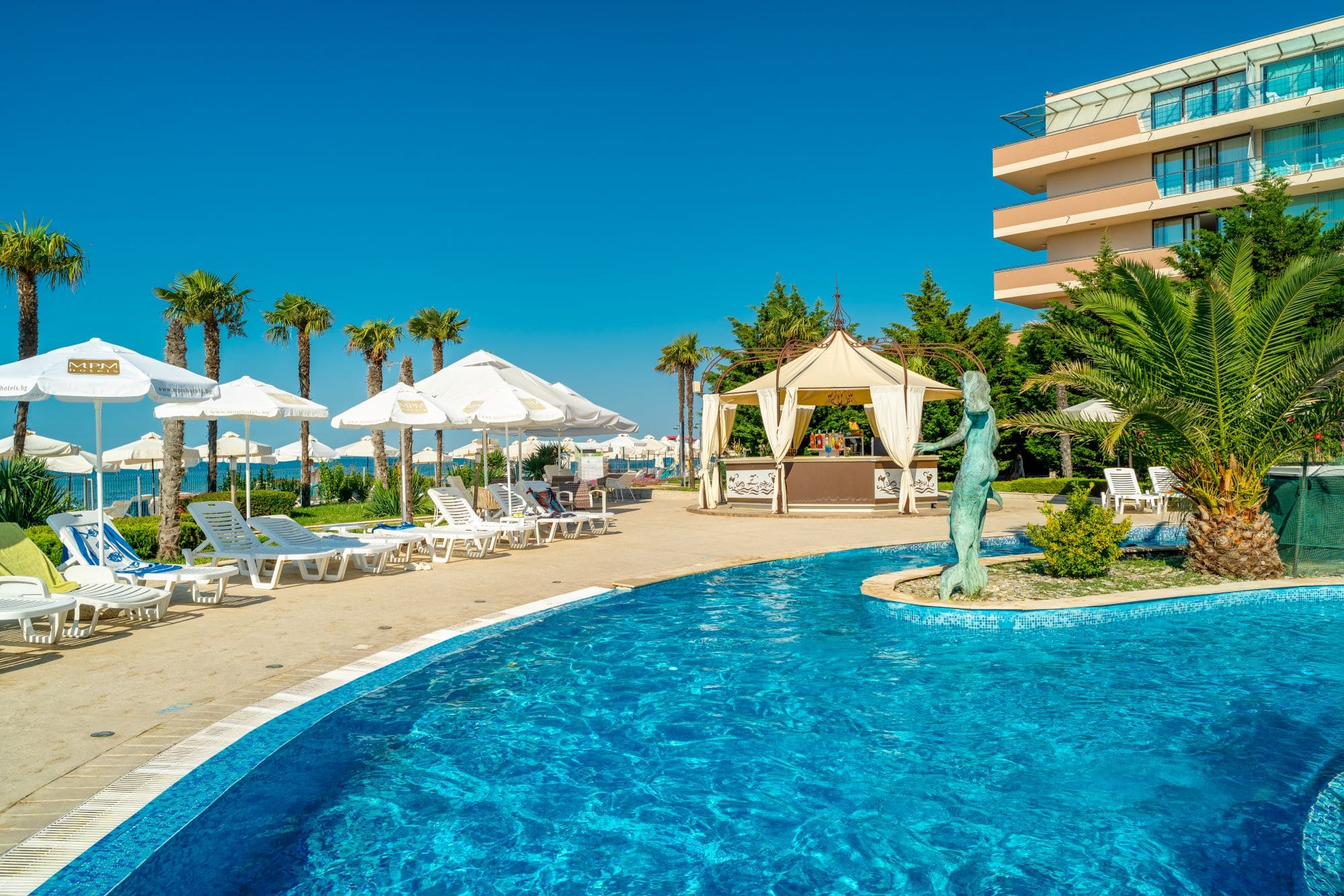 Хотелът се намира на първа линия с достъп до частен плаж. Има 2 външни басейна на територията на хотела, единият с детска част и мини детска пързалка. Безплатни чадъри и шезлонги около басейните.