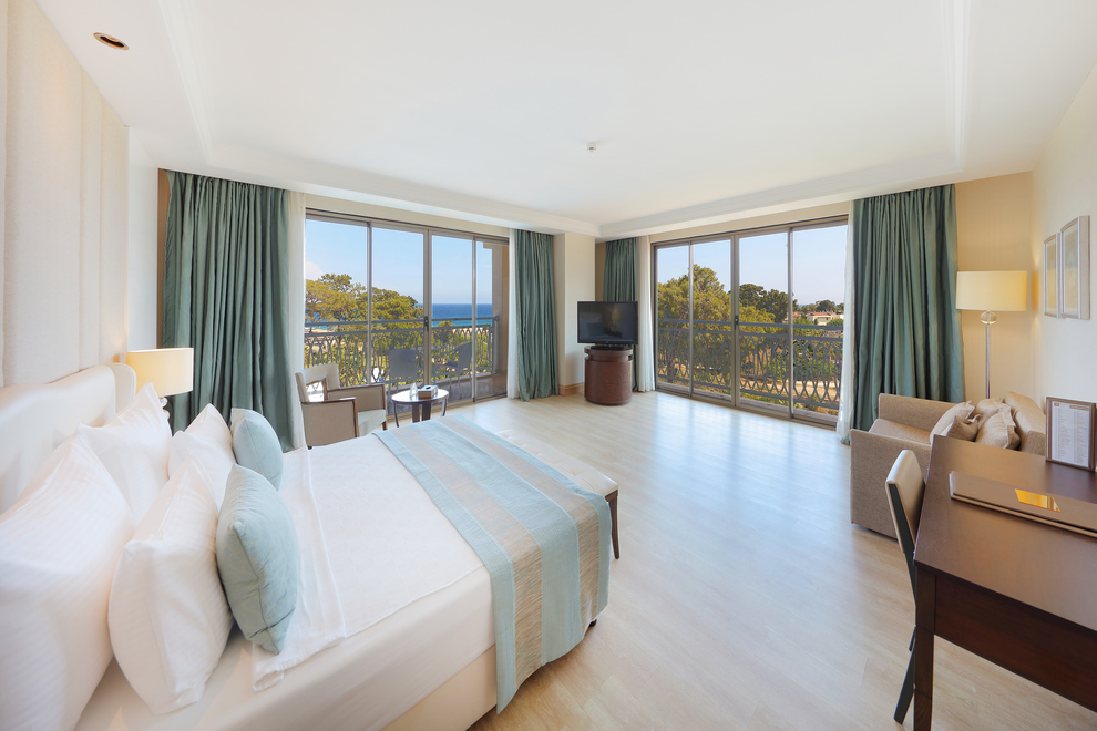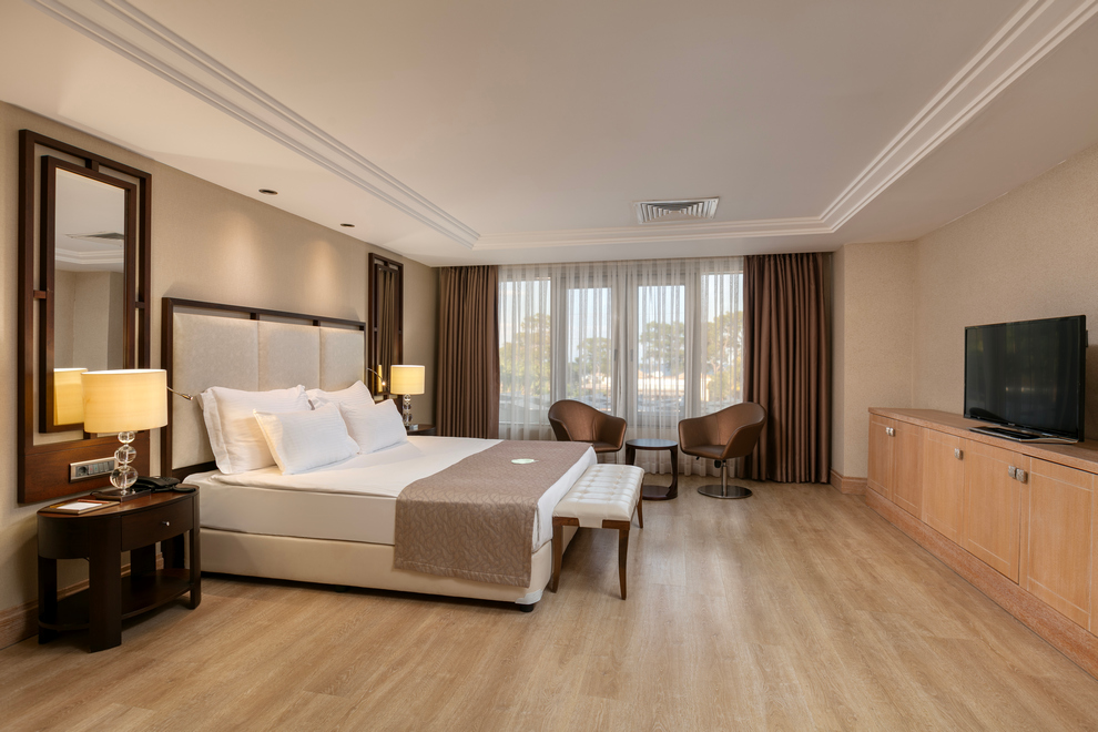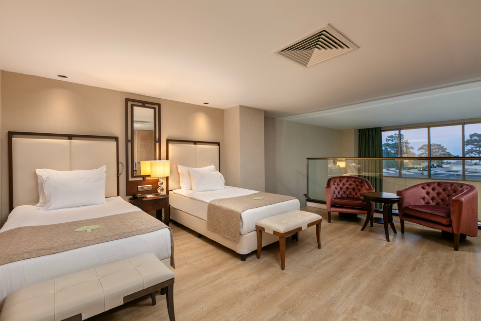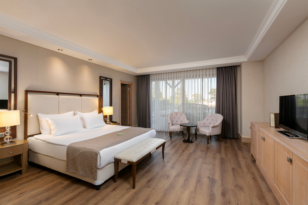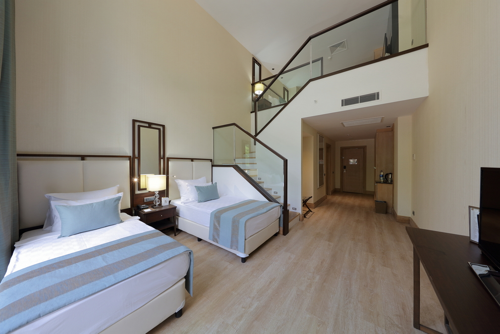 Хотелът се състои от една 5-етажна сграда, в която са разпределени 410 климатизирани стаи. Те са оборудвани с телефон, електронен сейф, минибар, комплект за приготвяне на чай и кафе, електрическа кана, безплатен Wi-Fi интернет, баня с вана/душ, сешоар, луксозни халати и чехли (цветни за децата), балкон. Стаите се почиства ежедневно.