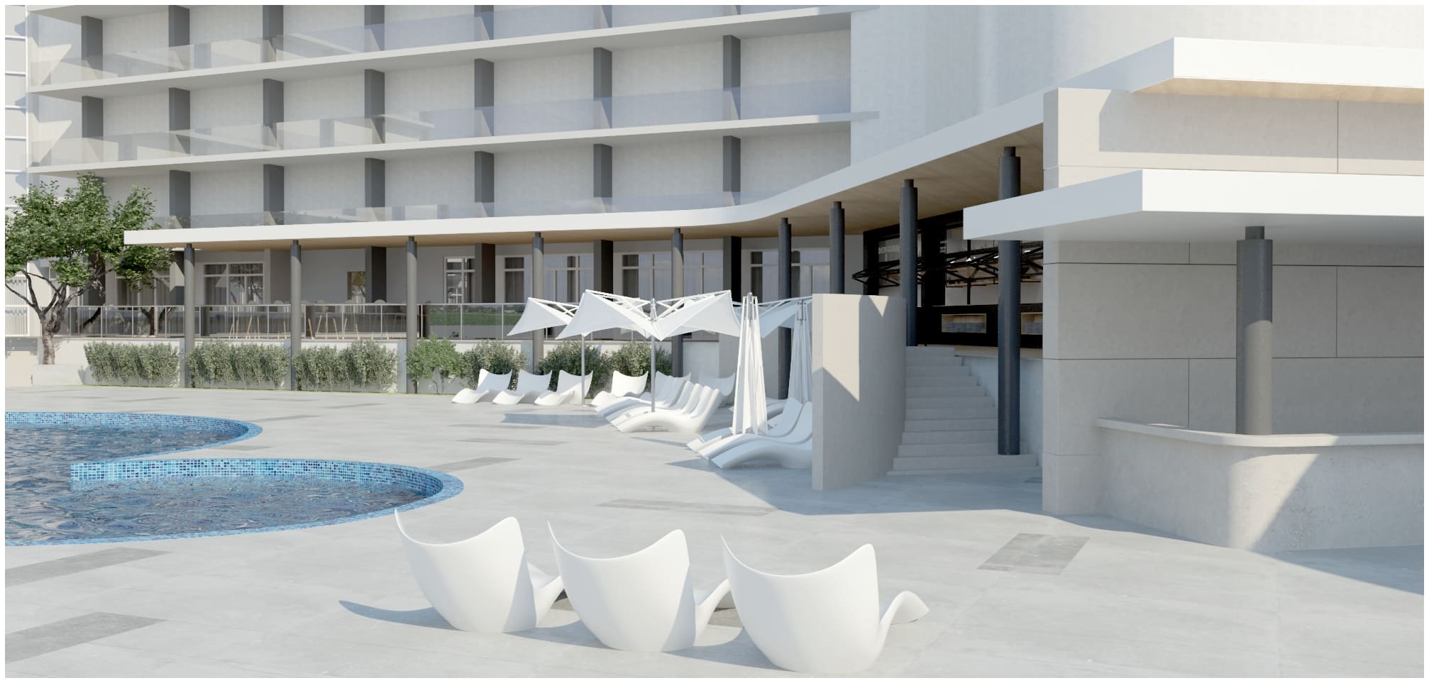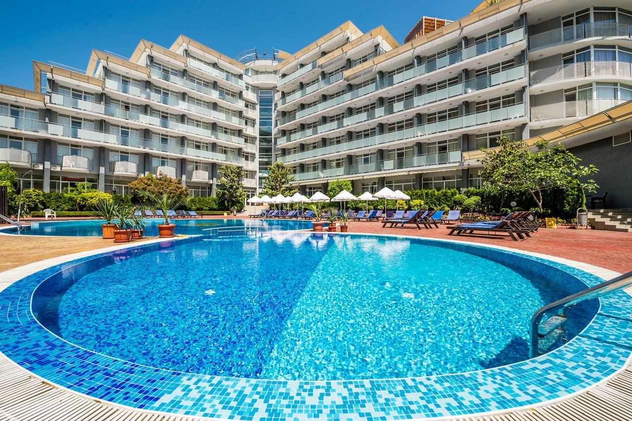 Външен басейн, Чадър и шезлонги около басейна. Анимация за възрастни развлекателни, вечерни шоу програми, Фитнес, Аква гимнастика, Дартс, Водно поло