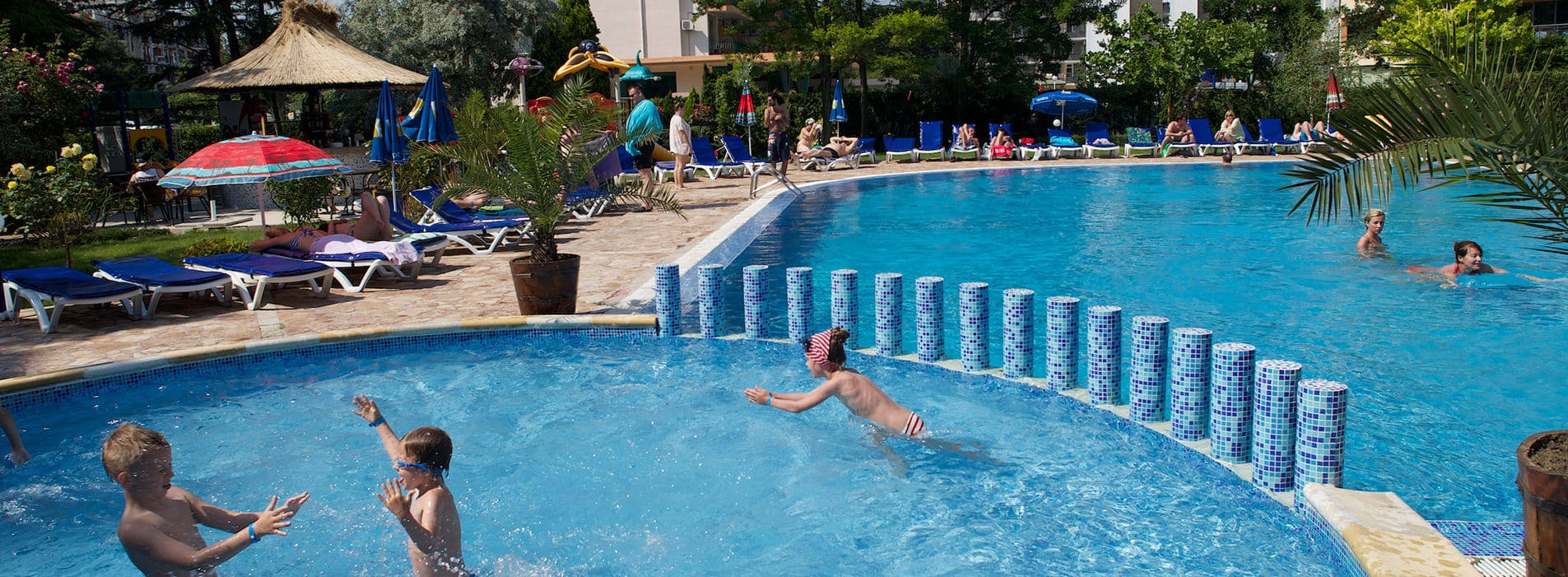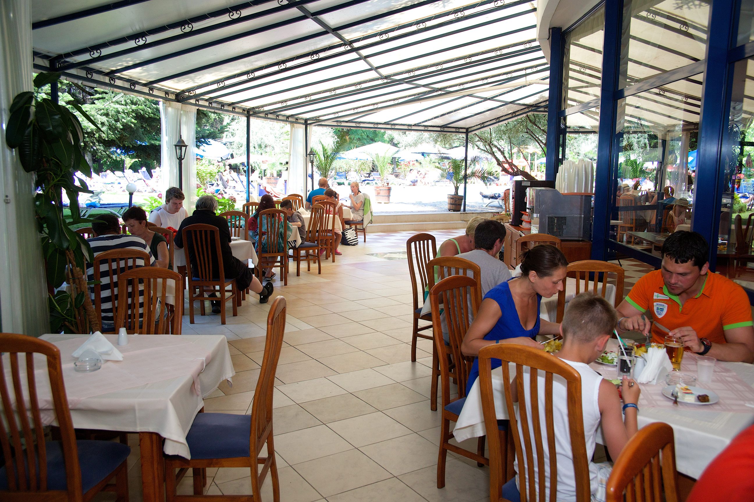 Ресторантът разполага със 180 места и голяма открита тераса с изглед към градината и басейна. Нон стоп лоби бар, пица и спагети ресторант, воден бар и детски кът в близост до него; открит басейн с отделна секция за деца;