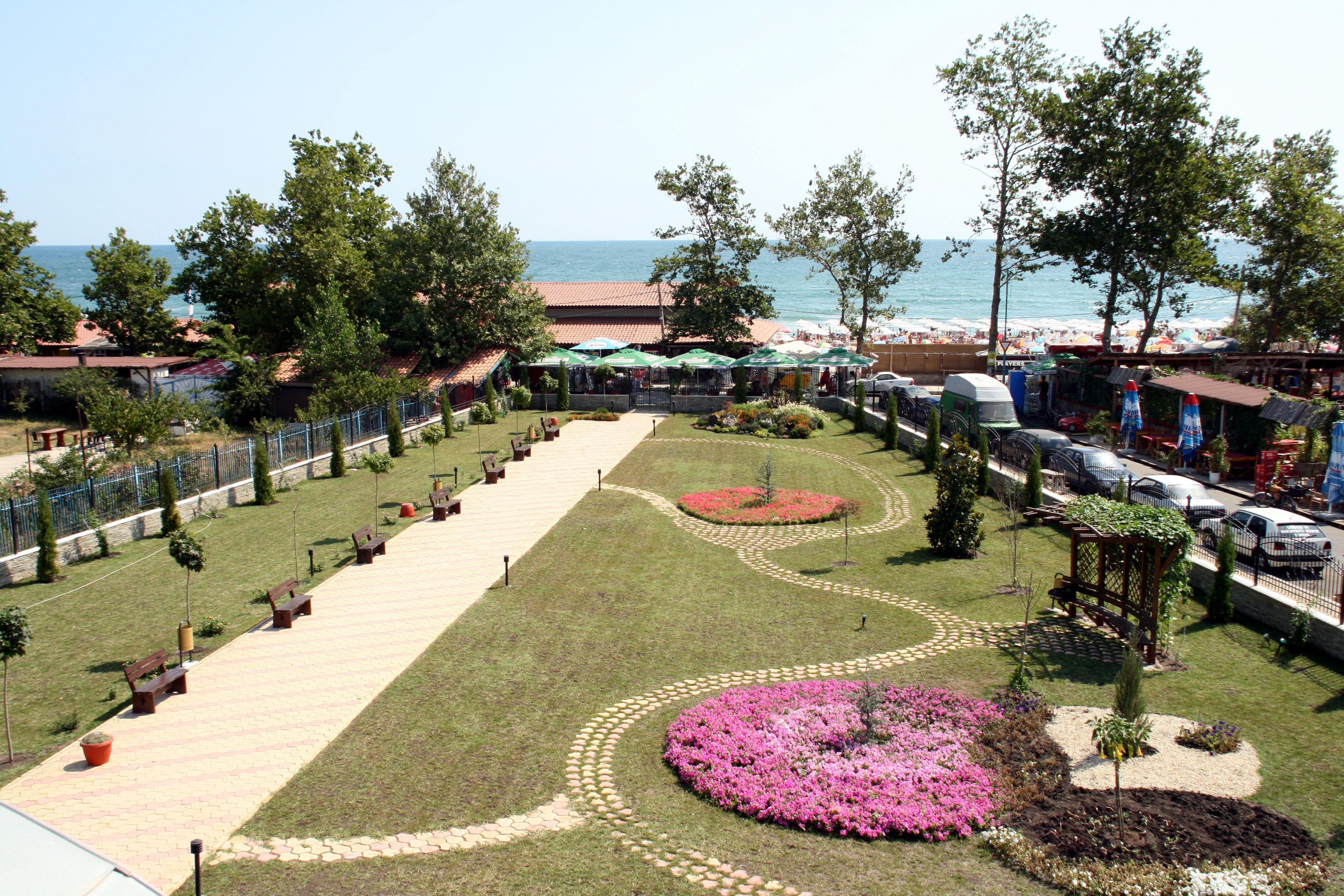 Голямата, прохладна градина, която води от басейна до плажа, разполага с пейки за отдих и много зеленина.