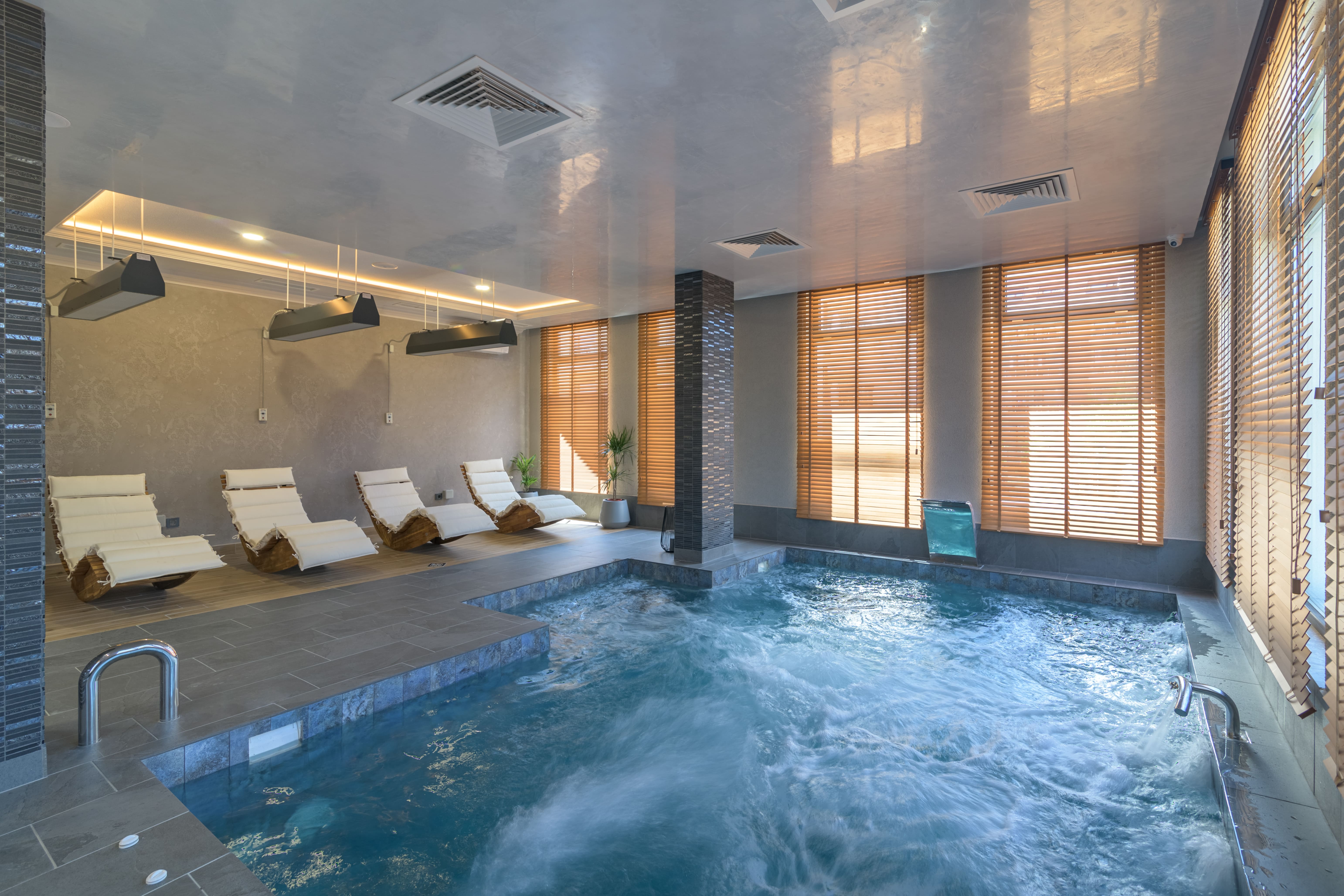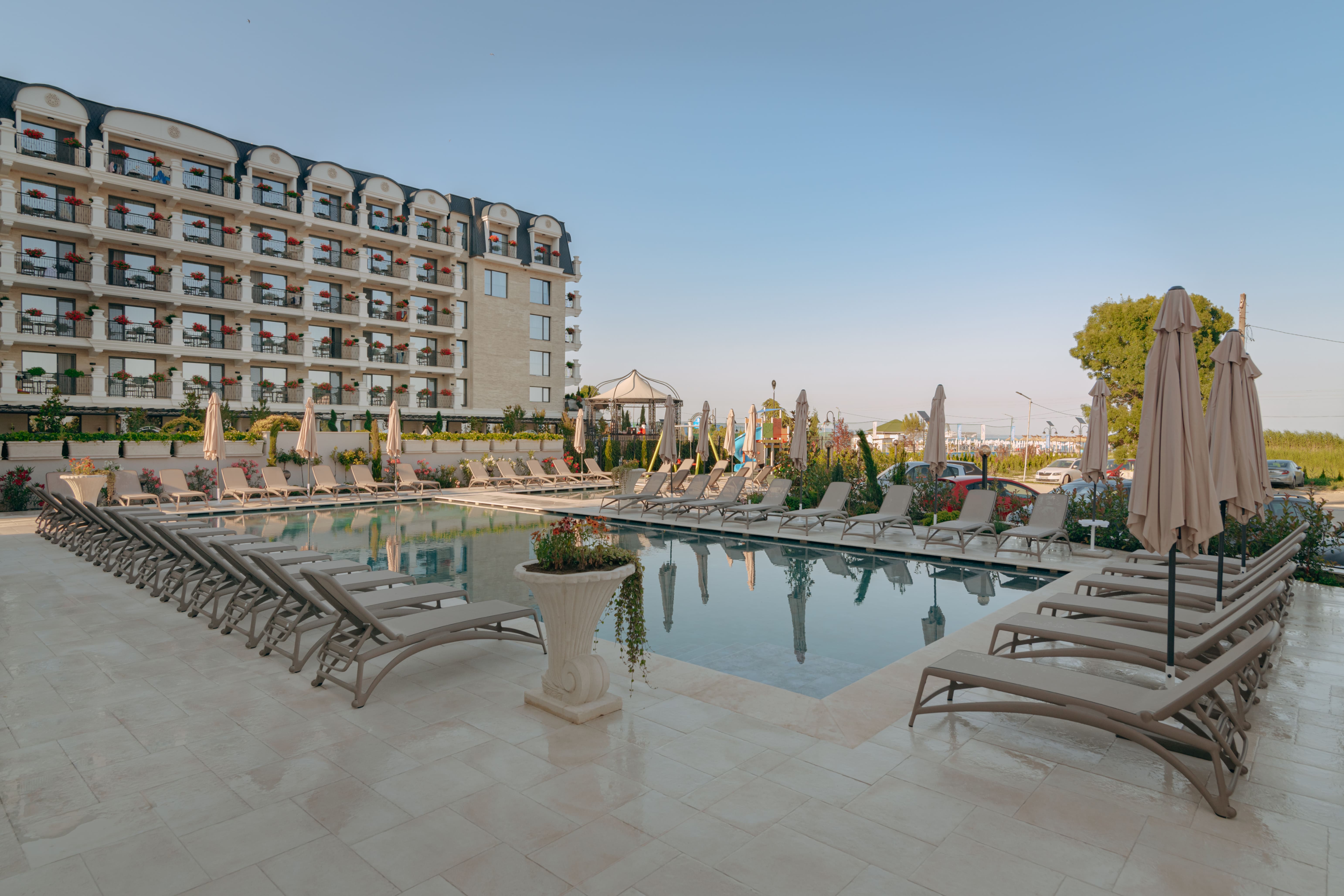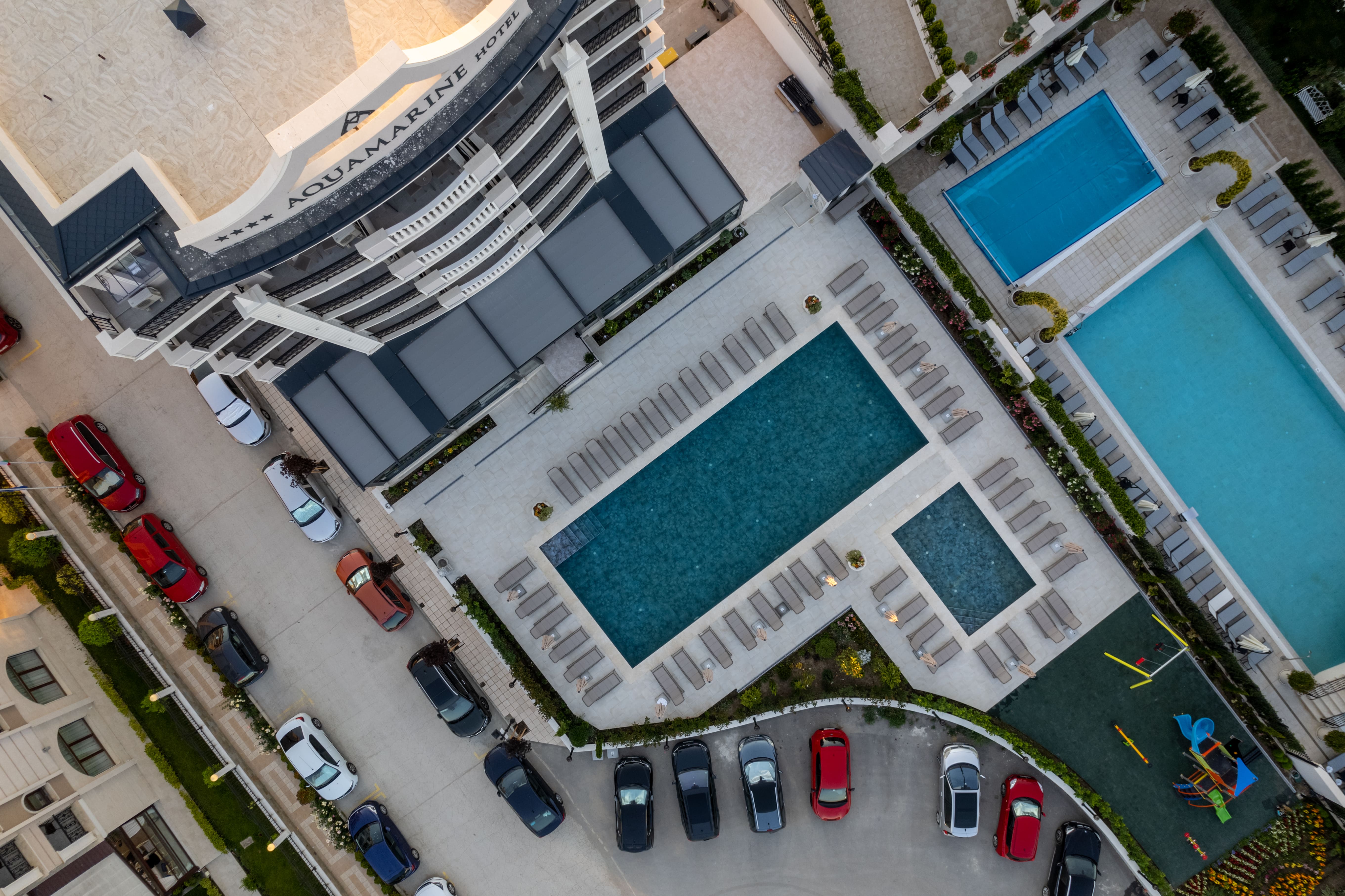 Позициониран на самият плаж, като го делят само 50 метра от ивицата с фин пясък и плитък плаж. гости Aquamarine предлага детски басейн, изцяло съобразен с нуждите на децата. Басейнът е с дълбочина 50см. И подходящ за деца от 3 до 8год. възраст. Басейнът е в непосредствена близост до детската площадка, така спокойно може да събирате тен докато наблюдавате децата си.