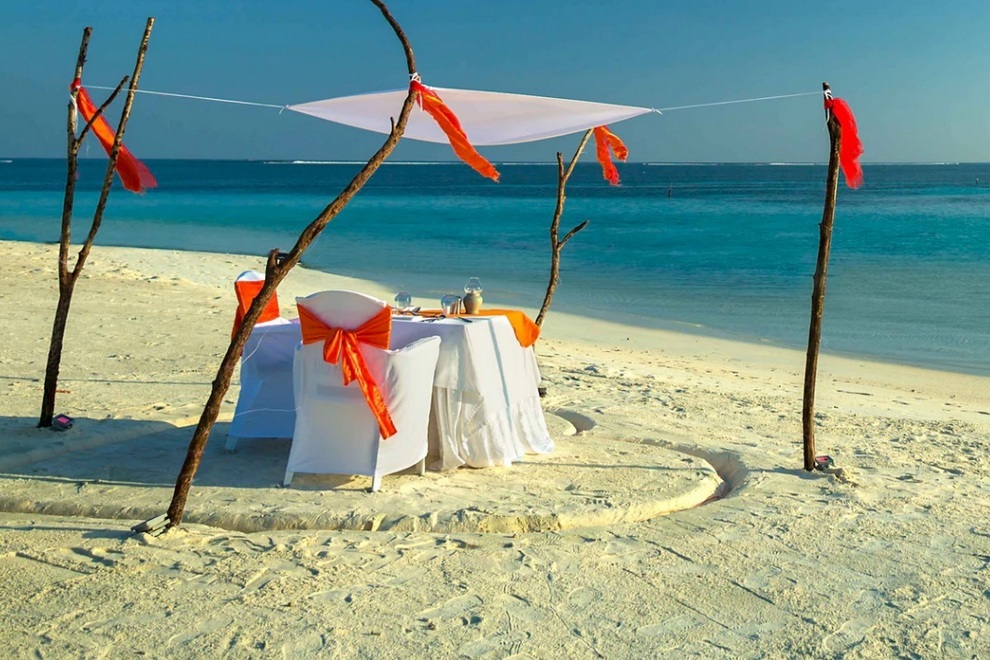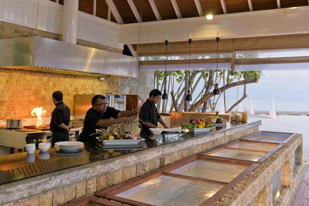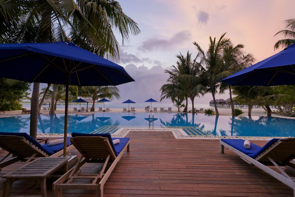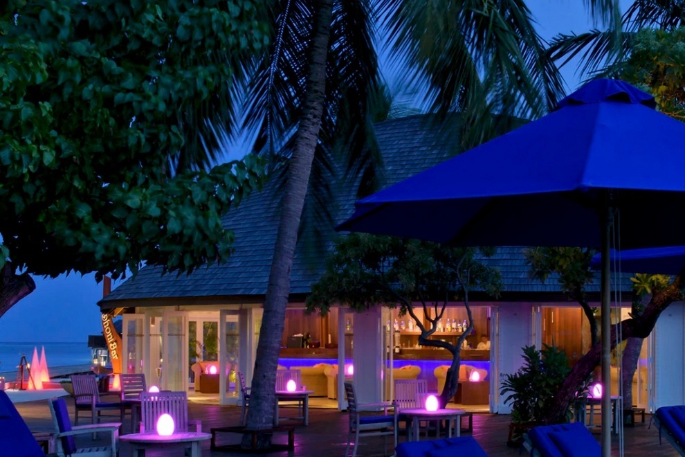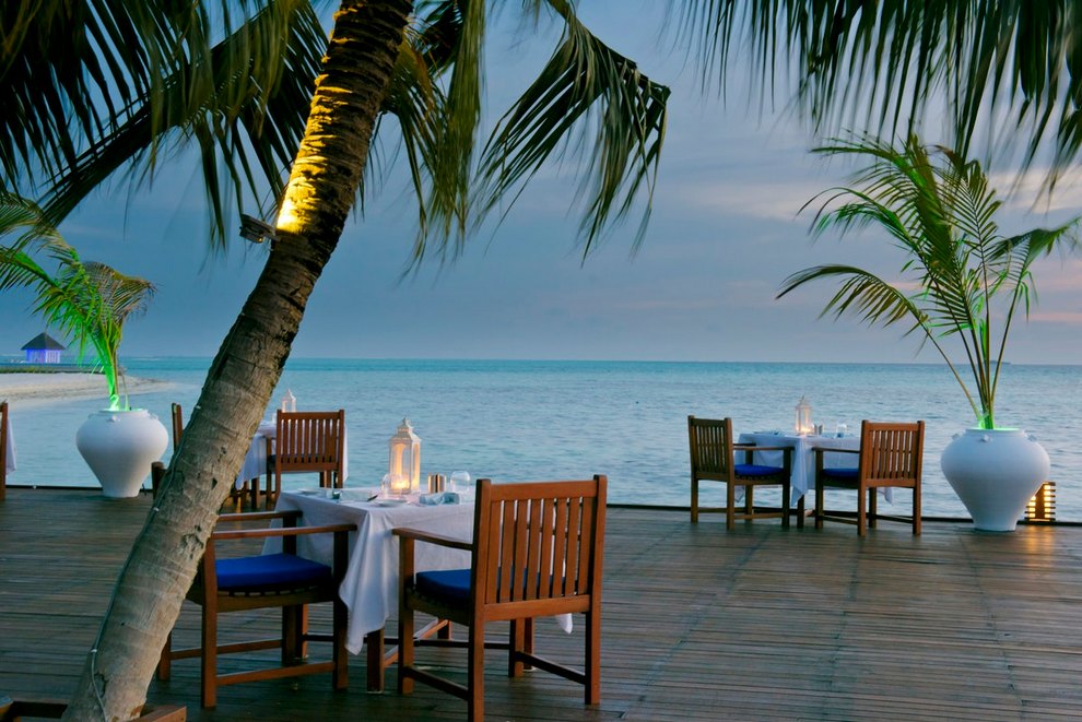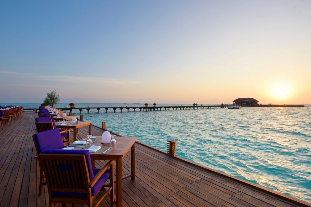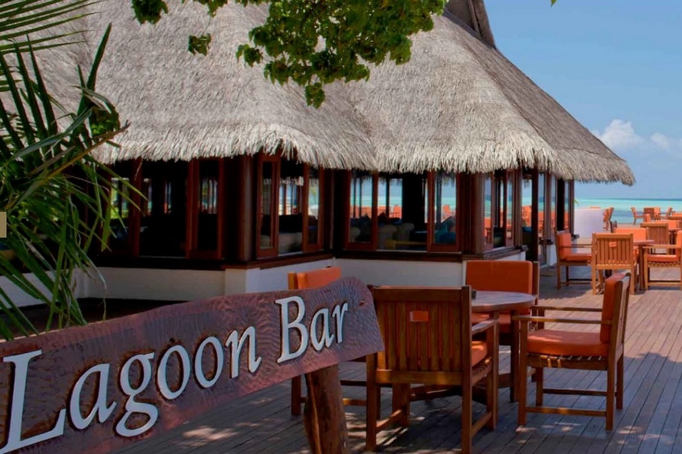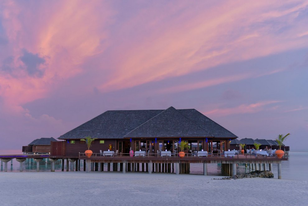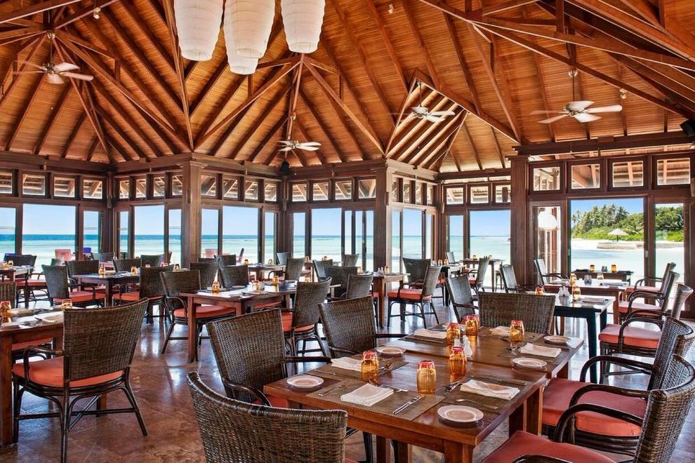 На разположние на гостите е "Sunset Restaurant" - основният ресторант на хотела, разположен над водата: закуска: 07:30-10:00 ч., обяд: 12:30-14:30 ч., вечеря: 19:00-21:30 ч. Шведска маса. Фюжън кухня. Организират се тематични вечери. А`ла карт ресторантите: Ресторант „Lagoon“ се намира до плажа с изглед към лагуната, отворен за обяд и вечеря от 12:00 до 22:30 часа. Средиземноморска кухня. „The Four Spices“ е азиатски ресторант, разположен над водата. Отворен за вечери по меню от 19:00 до 21:00 часа. За гостите, отседнали във вила с джакузи във Jacuzzi Water Villa, Prestige Jacuzzi Water Villa, Sunset Jacuzzi Water Villa и Presidential Suite, както и за гостите с план за хранене Premium All Inclusive, тук се сервира закуска на шведска маса от 7:30 до 10:00 часа. „The Plankton Grill“ е плажен ресторант с отворена кухня, който предлага морски дарове. Отворен е само за вечери от 19:00 до 22:00 часа. Необходима е резервация. „Island Pizza“ е пицария, разположена до басейна. Отворена е от 11:30 до 18:00 часа. Баровете: „Dhoni Bar“ - бар до басейна Infinity, сервира напитки и закуски. Западна и източна кухня. Работно време от 12:00-22:30 часа. „Sunrise Bar“ - бар до главния басейн Sunrise, сервира напитки. „Lagoon Bar“ се намира над водата и сервира напитки и закуски. Западна и източна кухня. Работно време от 12:00-22:30 часа.