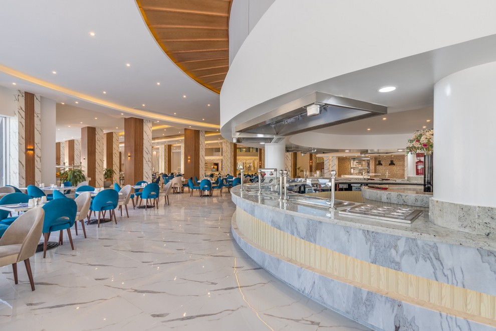 На разположние на гостите са 2 основни ресторанта, от които единият е само за възрастни. 5 а`ла карт ресторанта: Podium - международна кухня), La Casina - италиански, Zeta's - средиземноморски, Aika Dolli - египетски и Happy Buddha - китайски ресторант. Разнообразни напитки се прдлагат в 6 бара, има и шиша кът.