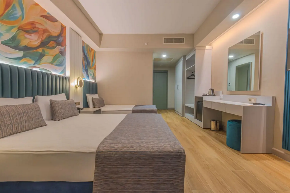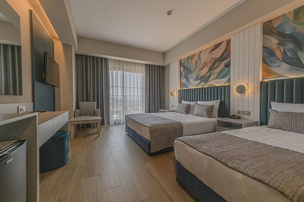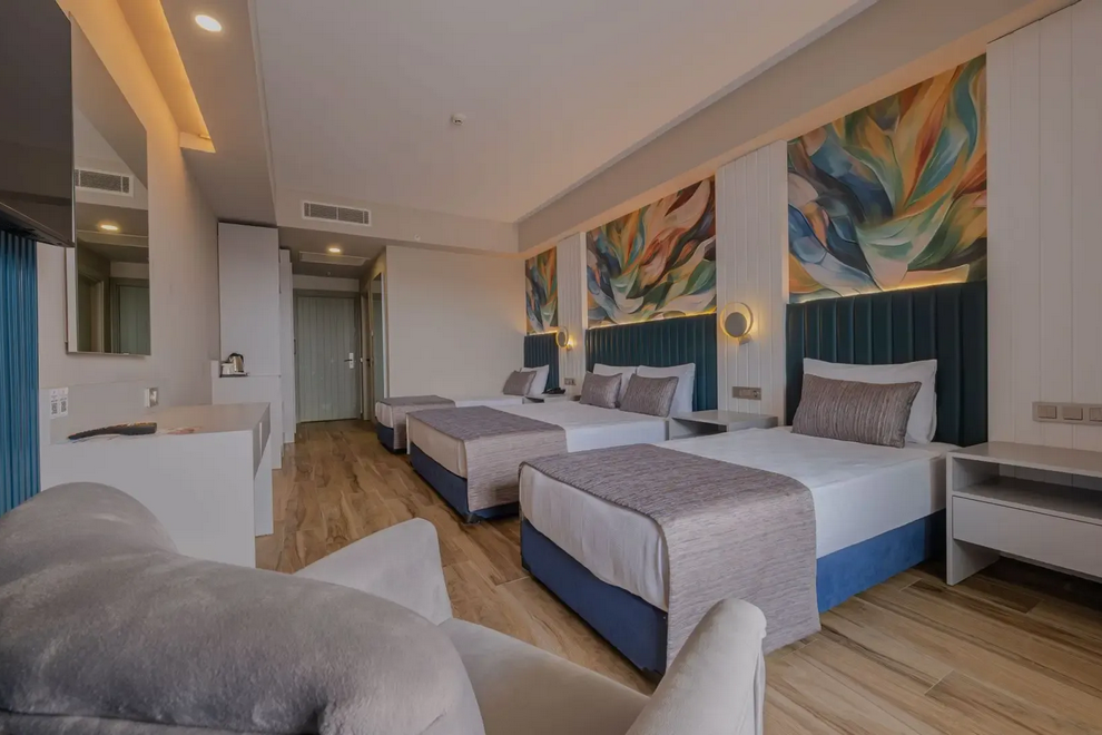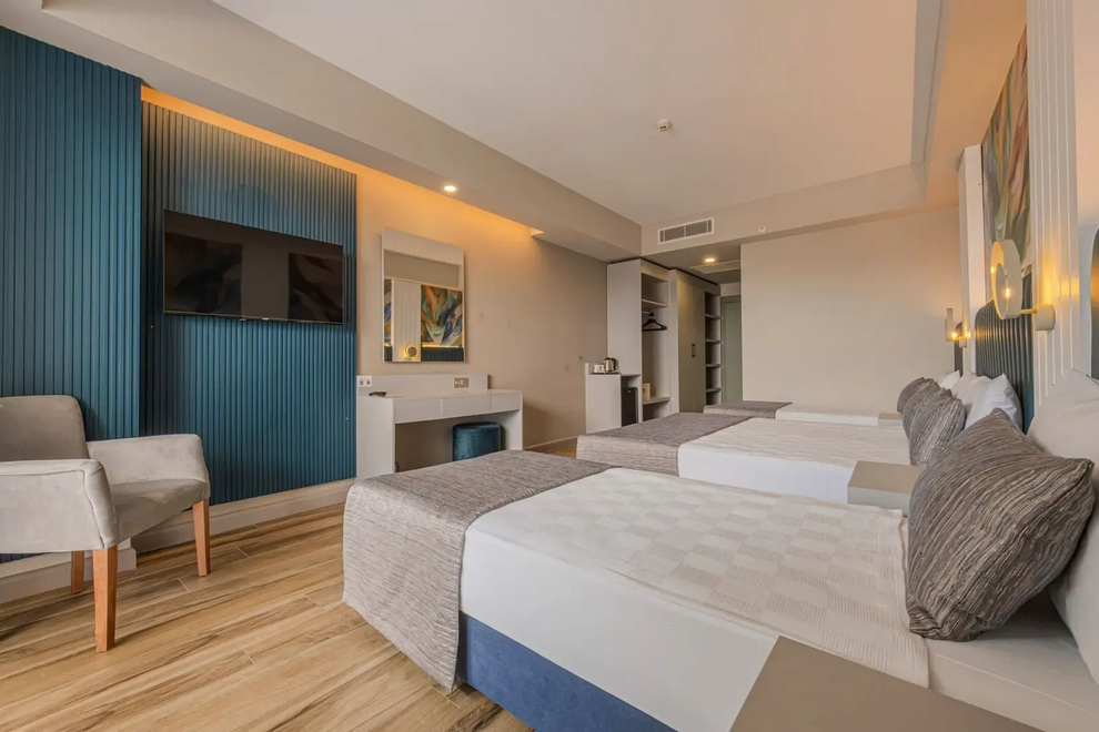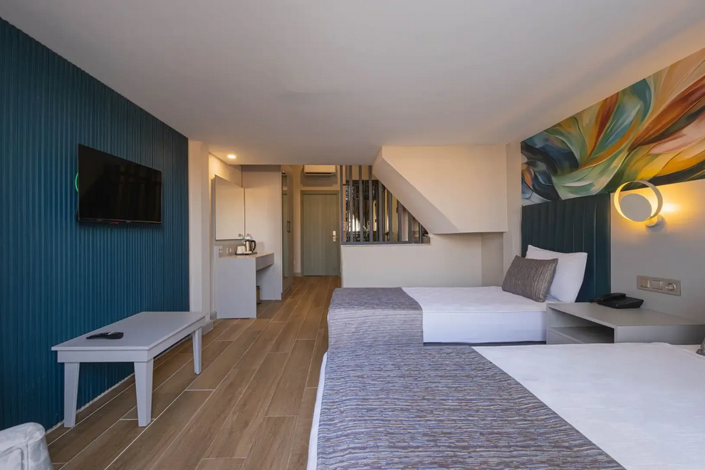 Family Room - Typ1 - 2 спални с междинна врата и една баня, всички стандартни удобства на стаите са налични. Всяка стая разполага със собствен LCD телевизор. Площ 40 кв.м, максимален капацитет: 2+2 - 3 - 3+1 - 4 души.