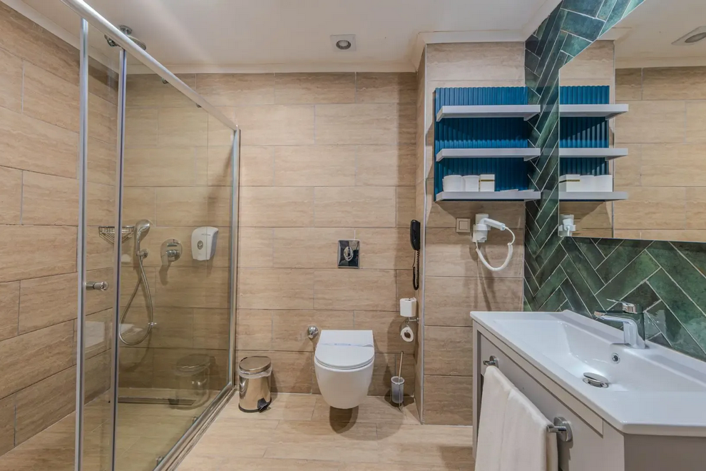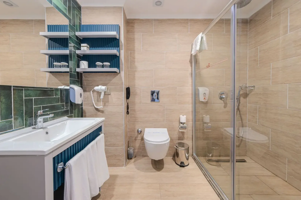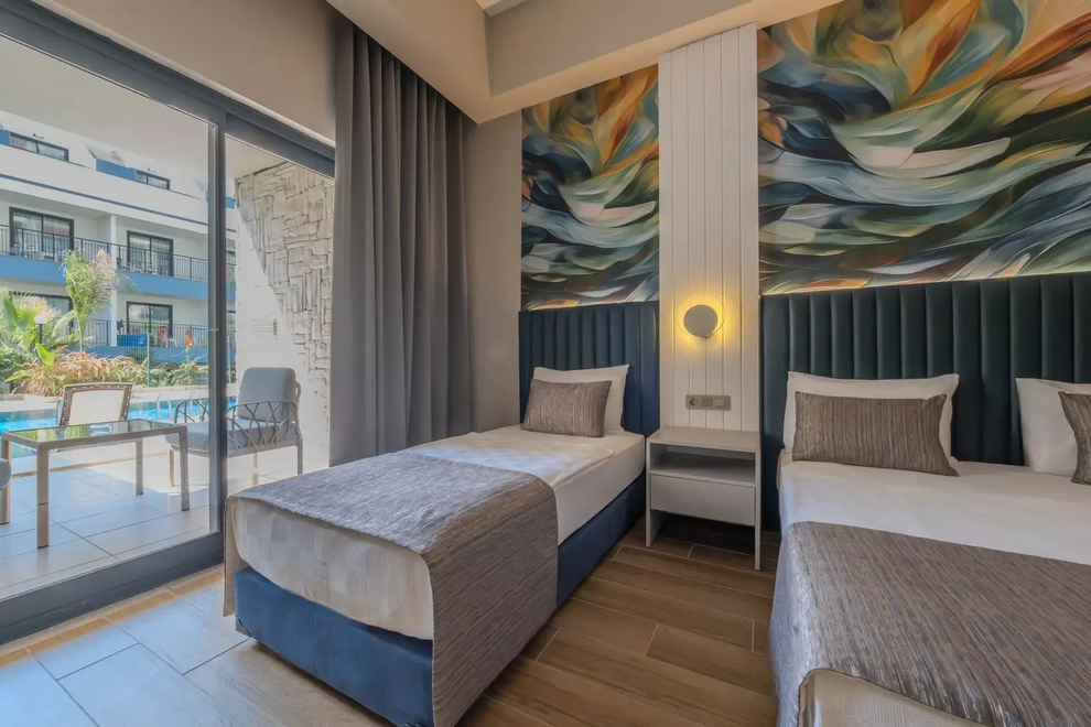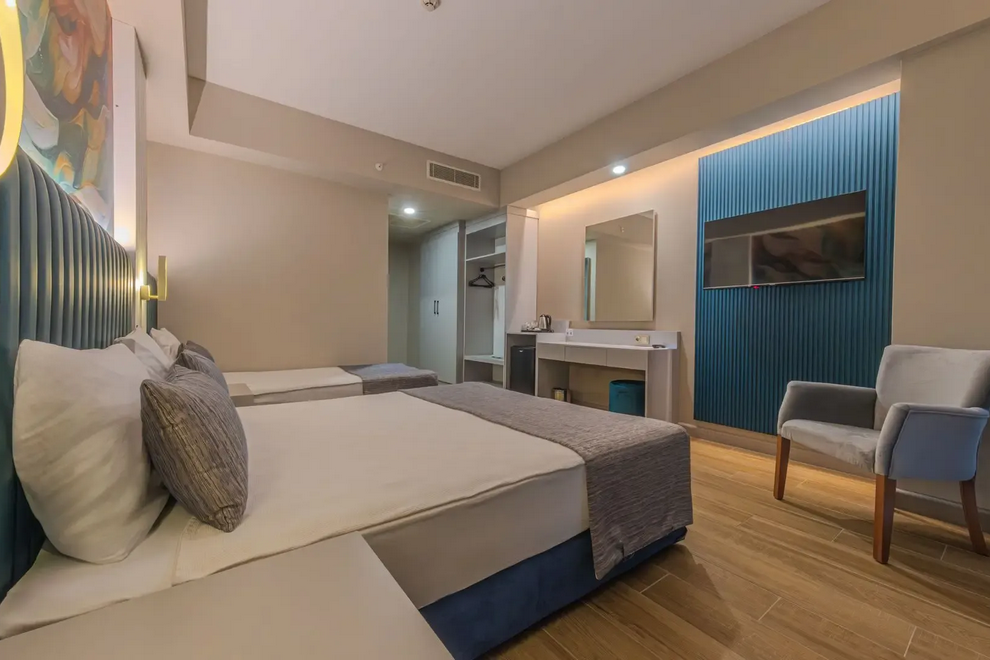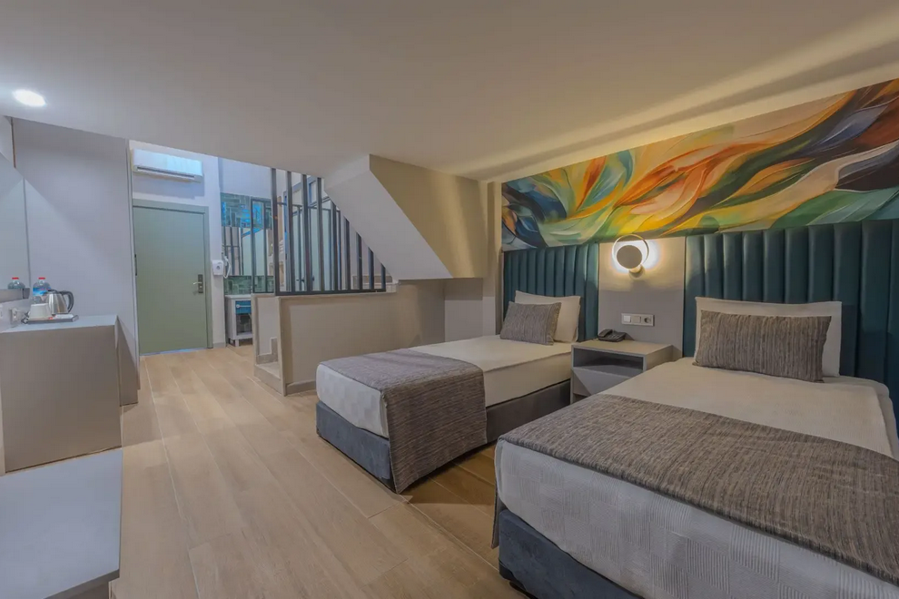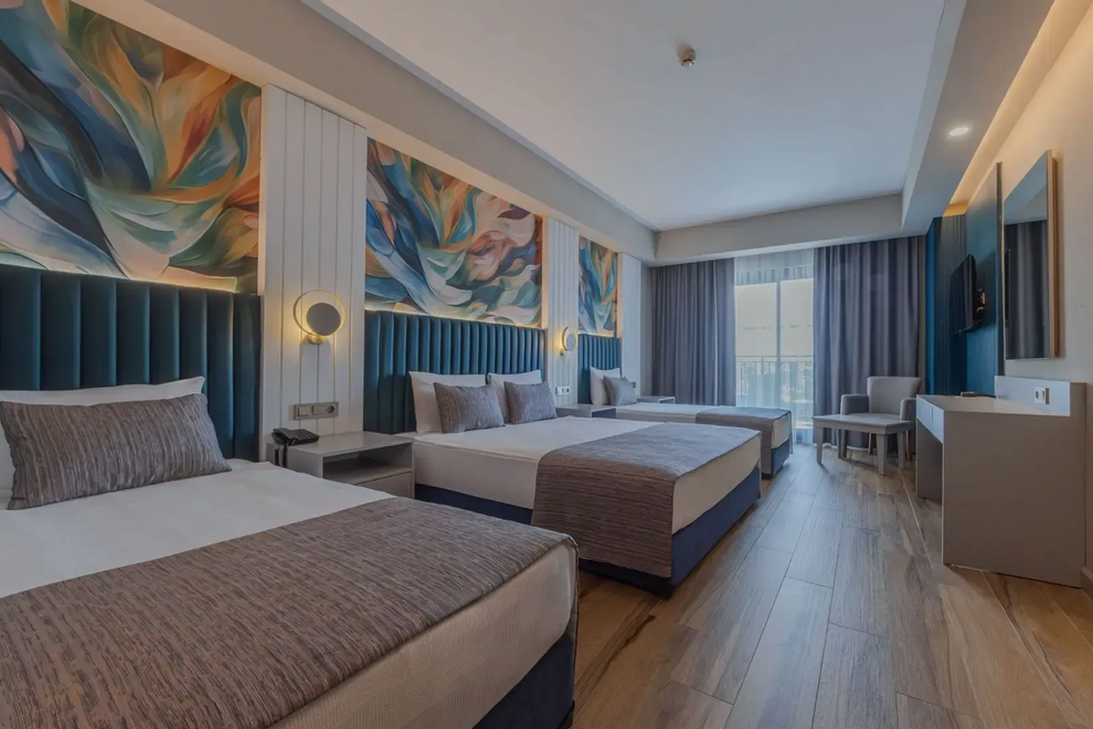 Family Room - Typ1 - 2 спални с междинна врата и една баня, всички стандартни удобства на стаите са налични. Всяка стая разполага със собствен LCD телевизор. Площ 40 кв.м, максимален капацитет: 2+2 - 3 - 3+1 - 4 души.