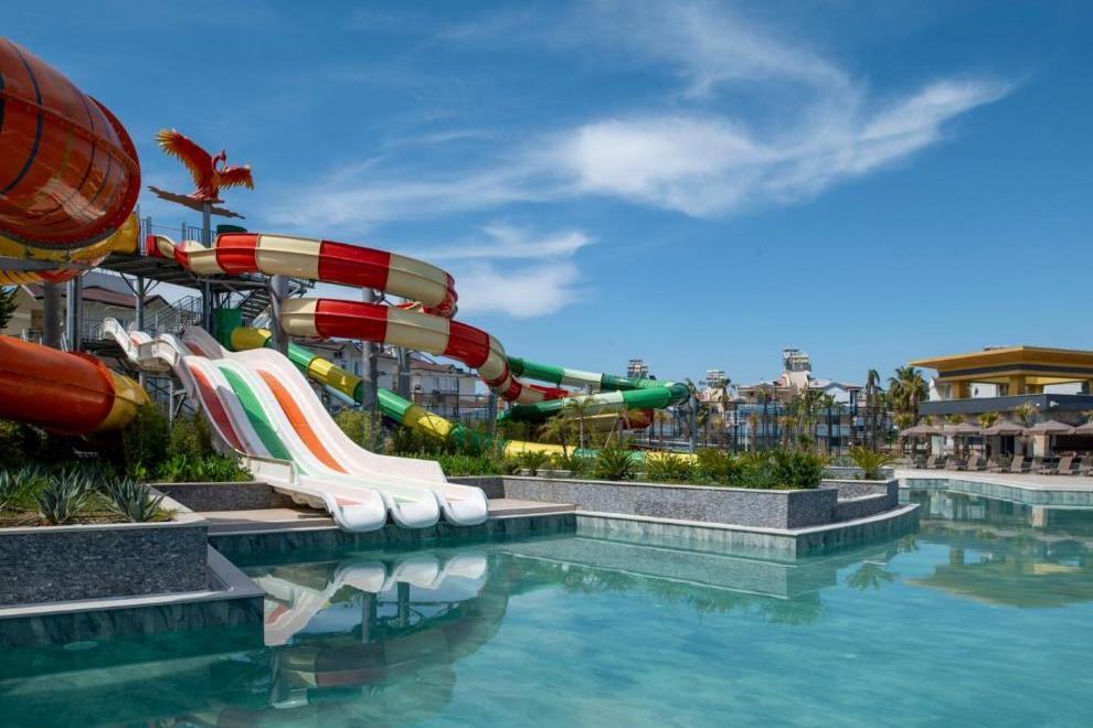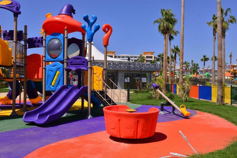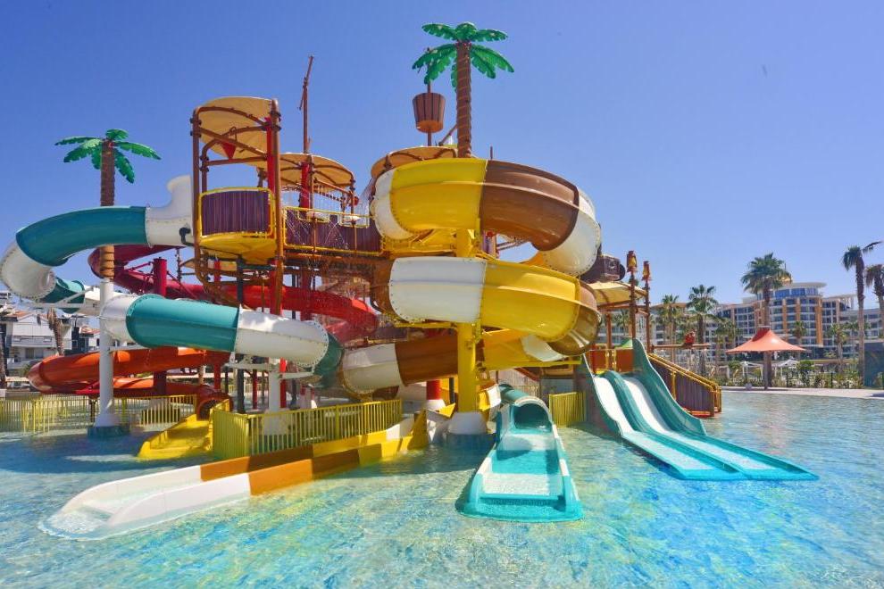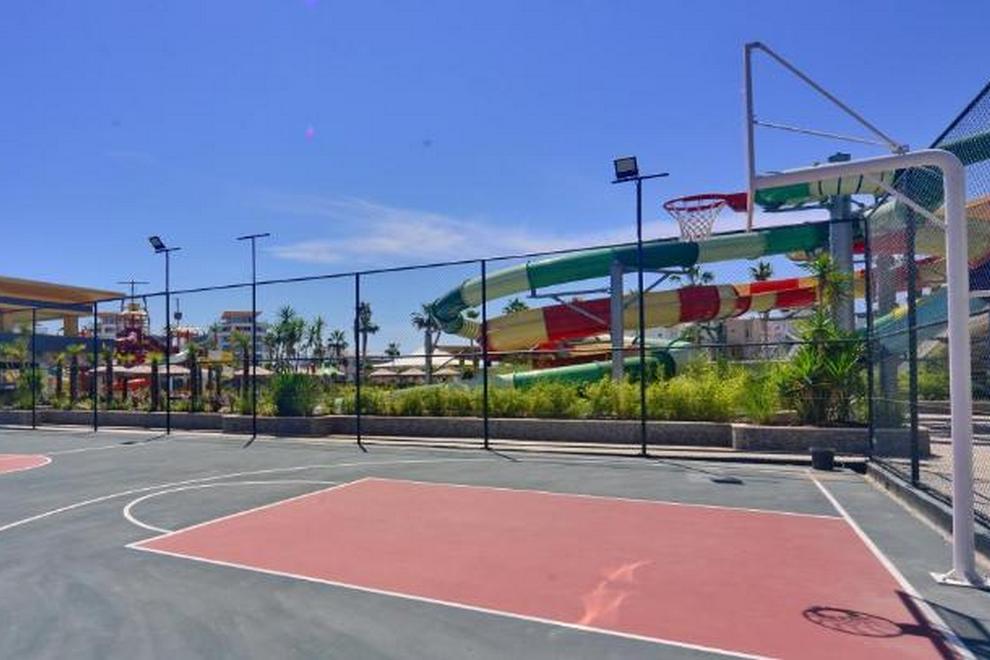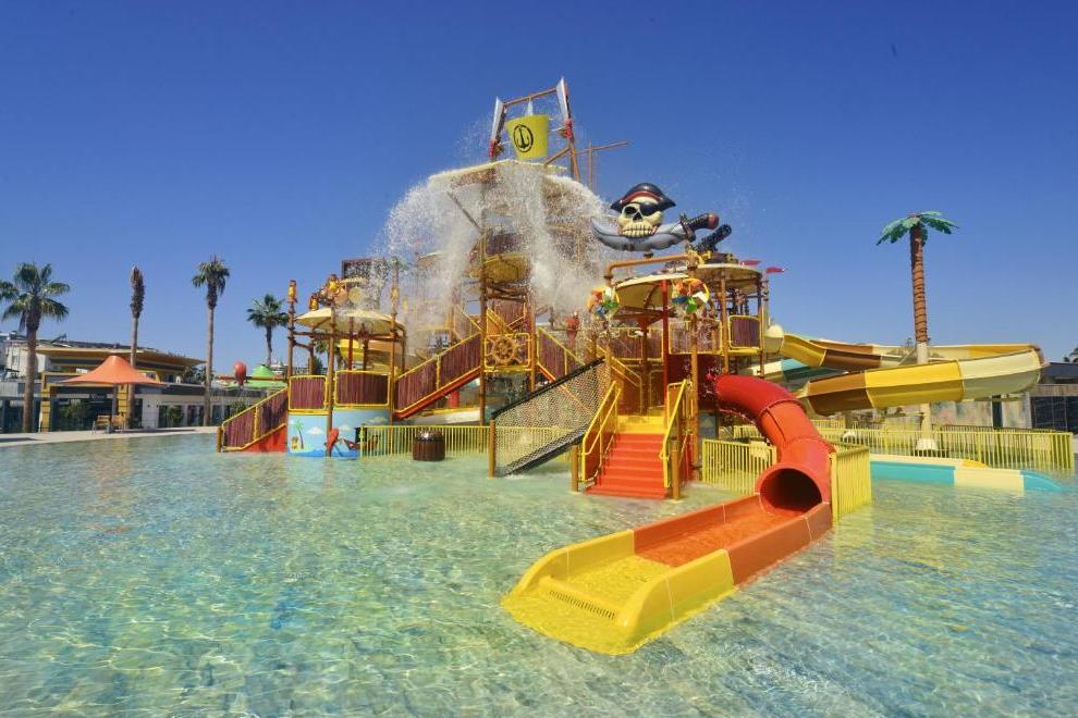 Собствен пясъчен плаж със ситни камъчета – на километър от сградата на хотела, осигурен е безплатен шатъл бус. Плажът е дълъг 125 метра и разполага със 120 шезлонга и 60 чадъра, има снек ресторант, кабини и тоалетни. Открит басейн Oasis с обща площ от 266 кв.м + 12,5 кв.м закрит басейн. Басейнът Survivor Park е с обща площ от 962 кв.м и включва един басейн и специално проектирана зона за плуване за деца. Аквапаркът разполага с 5 различни пързалки с обща площ от 727 кв.м и дълбочина на басейна е 1,55 см. Чадъри и шезлонги на плажа и при басейна се ползват безплатно.