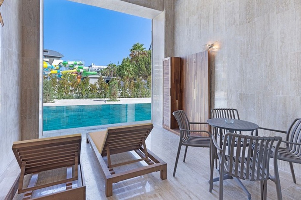 Собствен пясъчно-чакълест плаж на 250 м, до който се стига през градините на хотела или по моста. Основният басейн е с кръстосани мостове. Открит детски басейн с 5 водни пързалки. Два закрити басейна – за възрастни и за деца. Безплатно ползване на чадъри и шезлонги на плажа и при басейна.