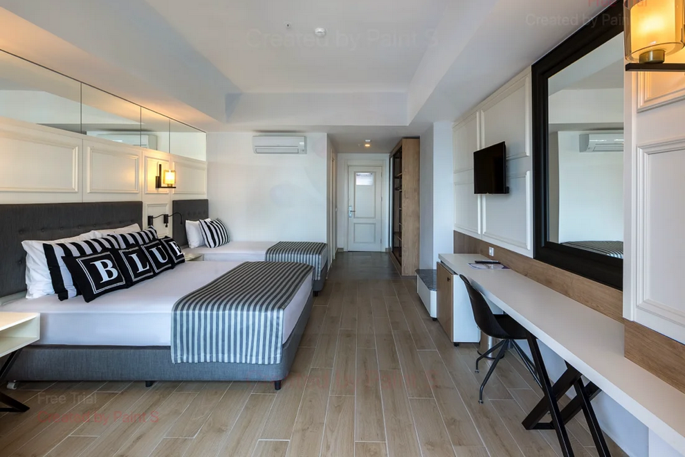 Largе Standard Room са с 1 двойно легло, 1 единично легло и разтегателен фотьойл, баня с душ, балкон, площ 35 кв.м, максимално настаняване 3+ 1 дете.