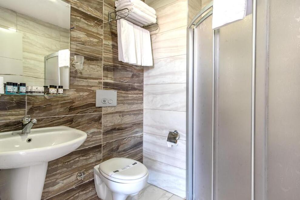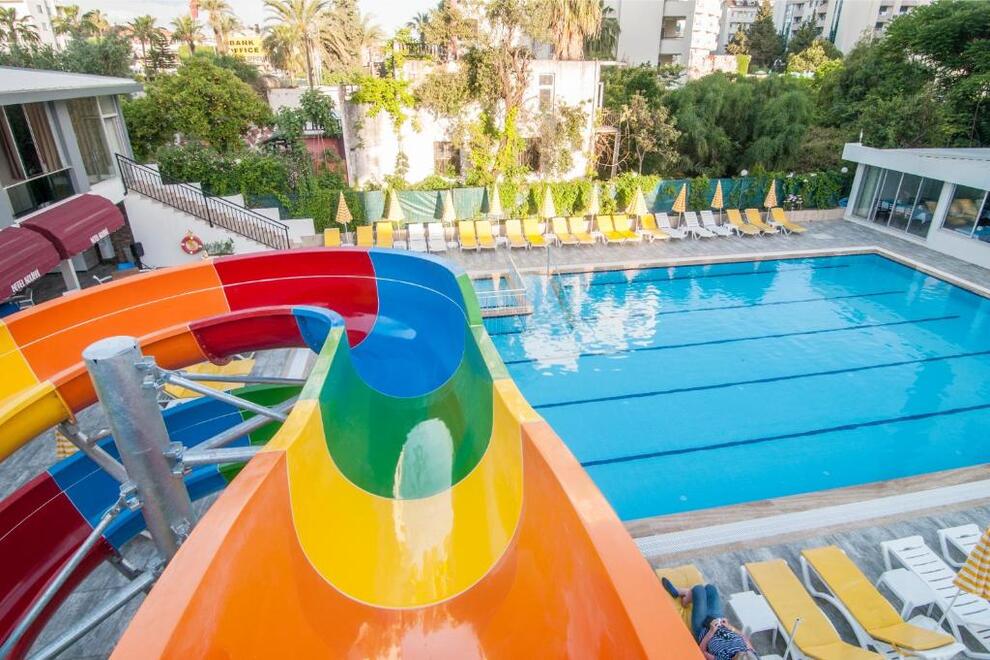 Собствена част от градски пясъчно-чакълест плаж, дълга 50 м. Хотелът има открит басейн с водна пързалка.