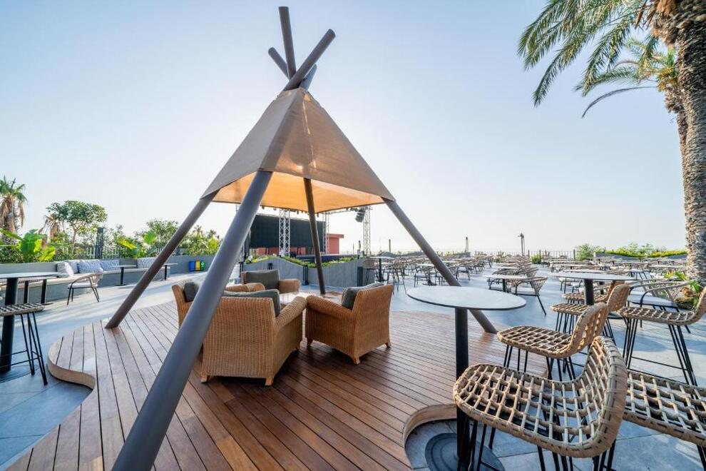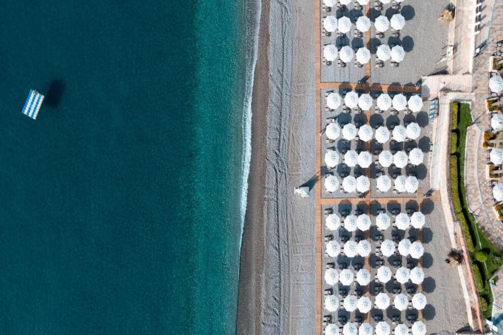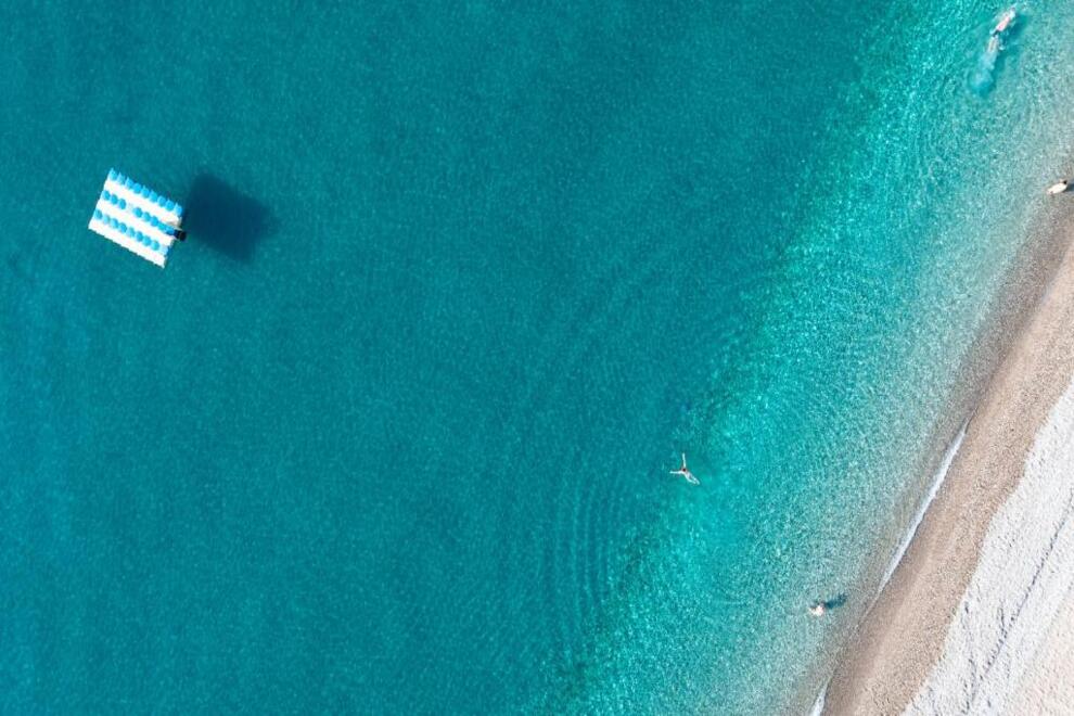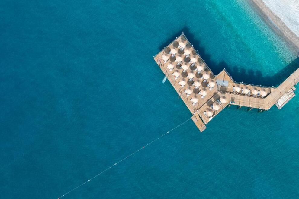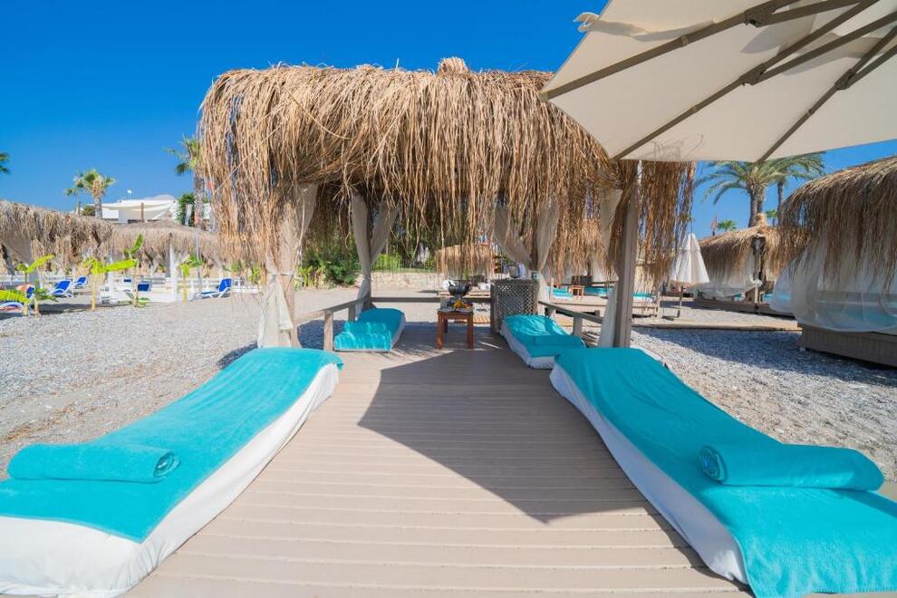 Собствен чакълест плаж и платформа. 3 открити, 1 закрит басейн и аквапарк. Чадъри, шезлонги и плажни кърпи на плажа и при басейна се ползват безплатно.