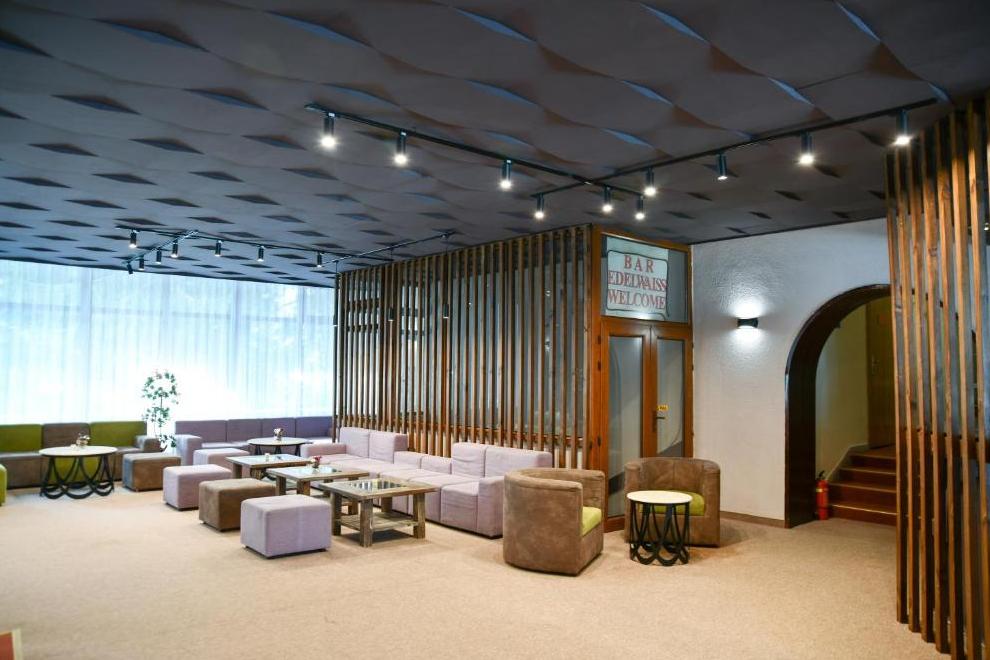 Еделвайс разполага с дневен бар, както и ресторант със 150 места и уютна камина, предлагащ висококачествена кухня, местни ястия, домашни специалитети, а`ла карт меню и богат винен лист.