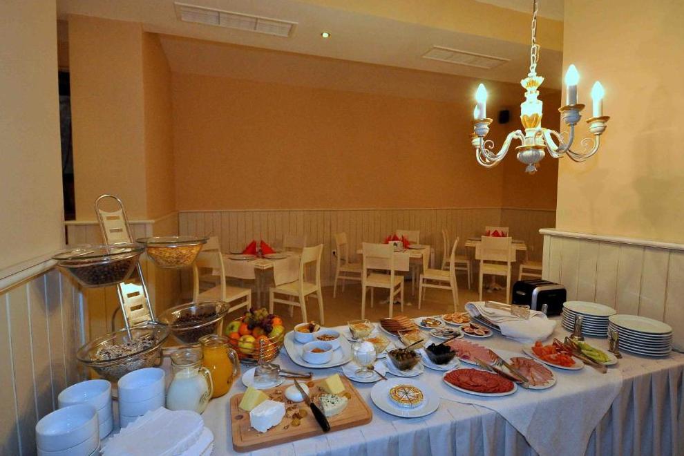 НОВОГОДИШНА ГАЛА ВЕЧЕРЯ: 120 лв. за възрастен; 60 лв. за дете от 6 до 11,99 години. Закуска се предлага в трапезарията. Ресторантът разполага с 200 седящи места. Тук можете да обядвате или вечеряте, възползвайки се от свежо приготвената храна на блок маса или а`ла карт меню. Лоби барът на хотела е мястото където можете да се насладите на ароматно кафе, чай или да похапнете. Тук можете да се забавлявате на тематични вечери като българска, гръцка, македонска и др., както и на караоке бар, наргиле или просто да се отпуснете пред камината.