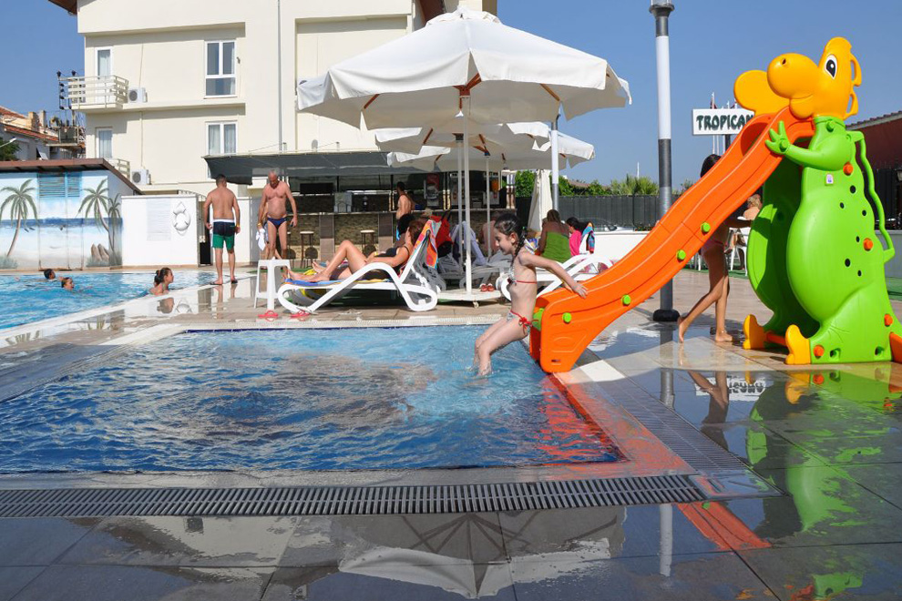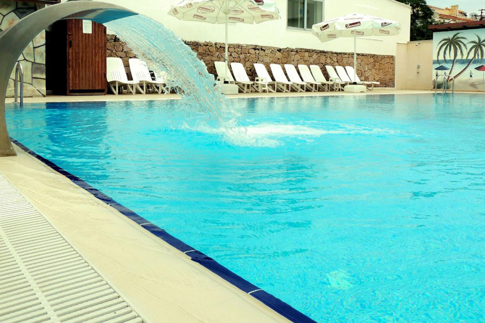 Собствен пясъчен плаж, 1 открит плувен басейн за възрастни и 1 открит плувен басейн за деца, водни пързалки. Чадъри и шезлонги на басейна и на плажа се предоставят безплатно.