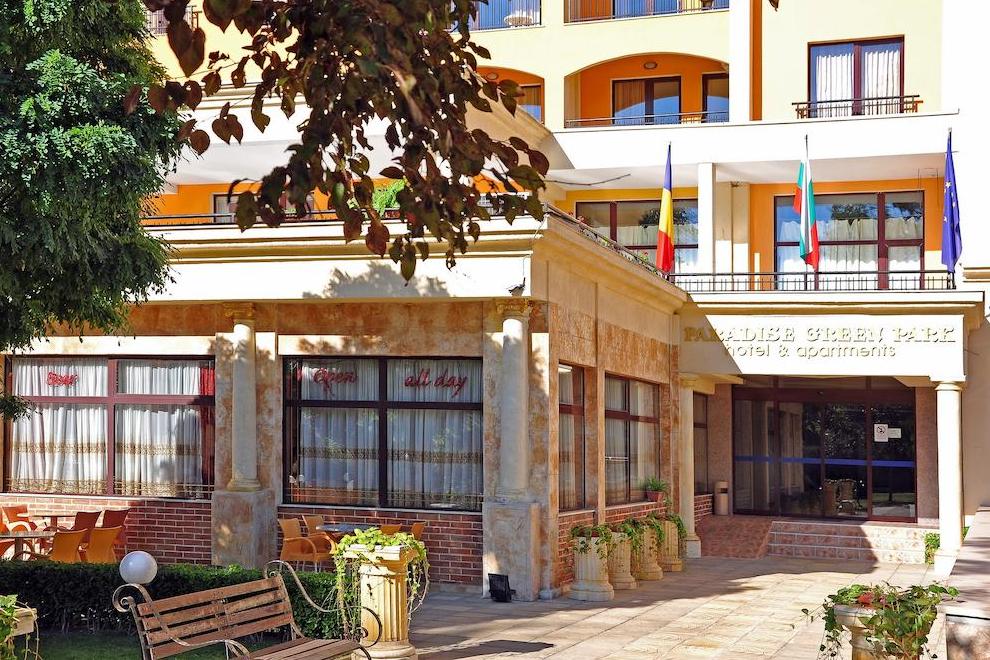 Парадайс Грийн Парк Хотел е луксозен жилищен комплекс, разположен в западната част на курорта Златни пясъци сред тиха и красива гора. Центърът на курорта се намира на 650 м, летище Варна е на 25 км. Най-близкият супермаркет е на 500 м от хотела, а най-близкият магазин – на 120 м. Комплексът се състои от 3 части, свързани помежду си и имат два приема.